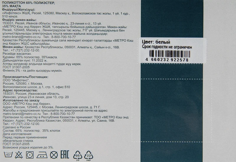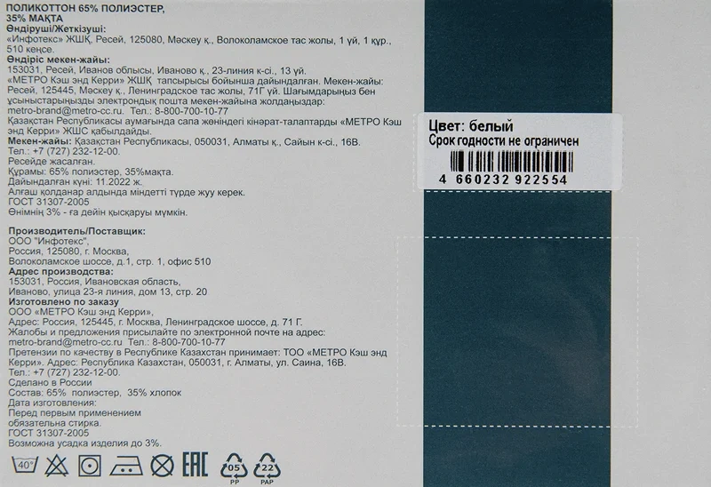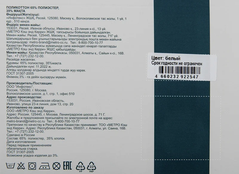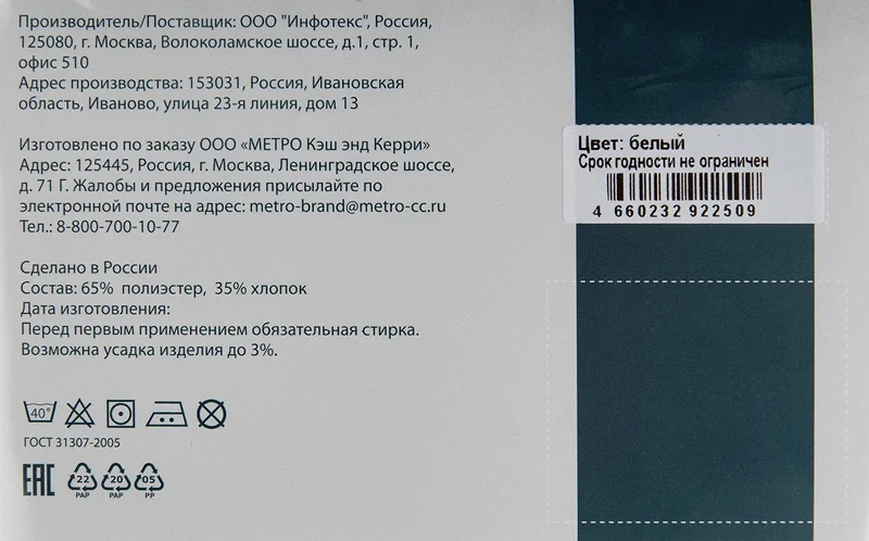 METRO PROFESSIONAL Пододеяльник белый поликоттон, 145 x 215см