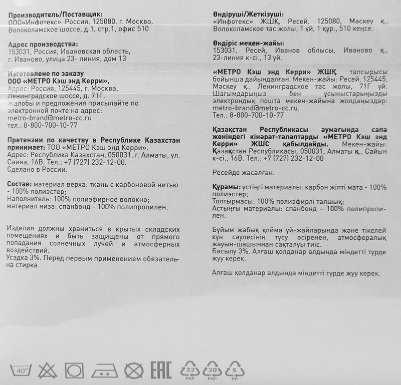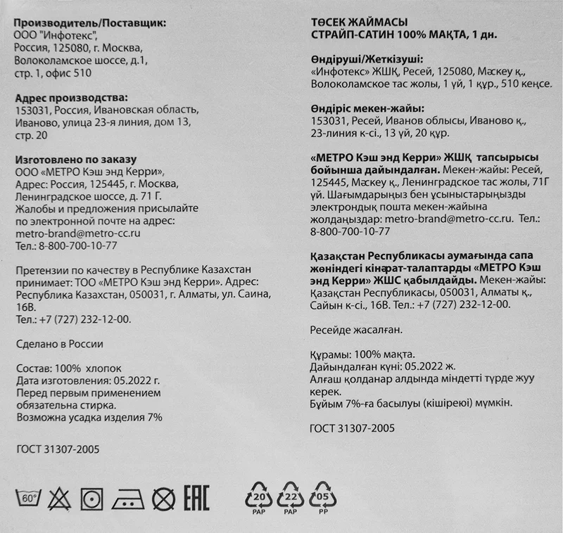 METRO PROFESSIONAL Пододеяльник сатин, 145 х 200см