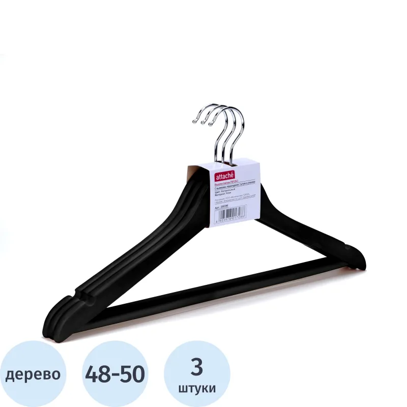 Плечики для одежды Attache 48-50 р, черные, с выемками, с перекладиной, 3 шт/уп