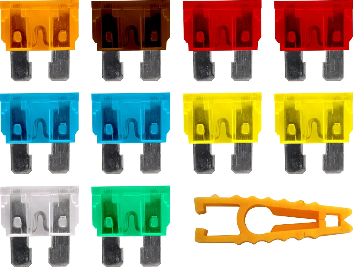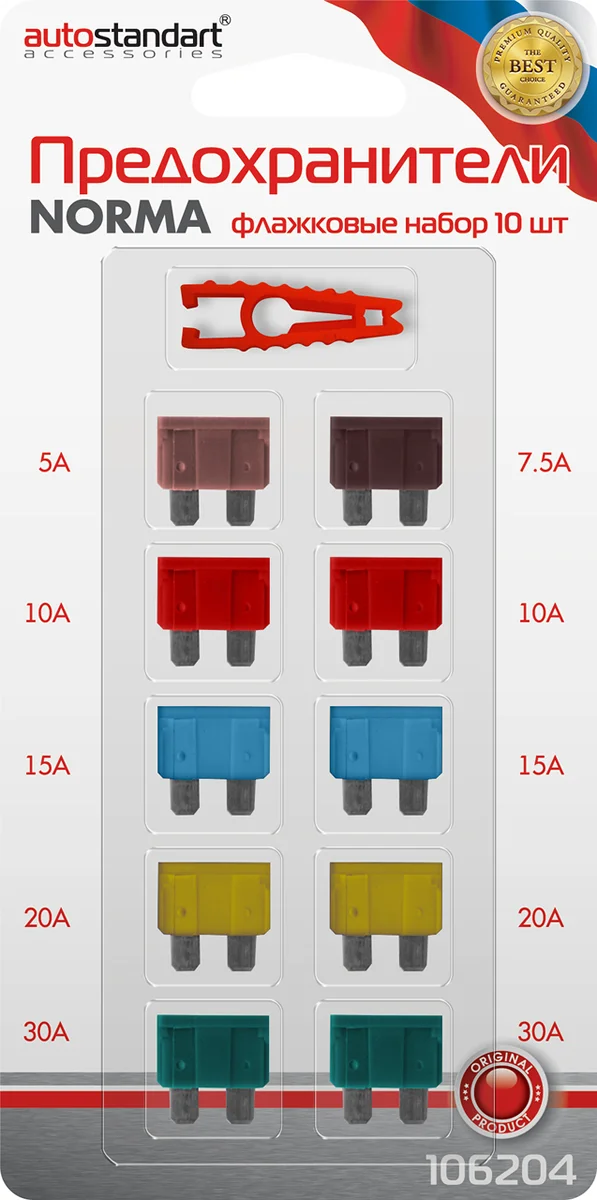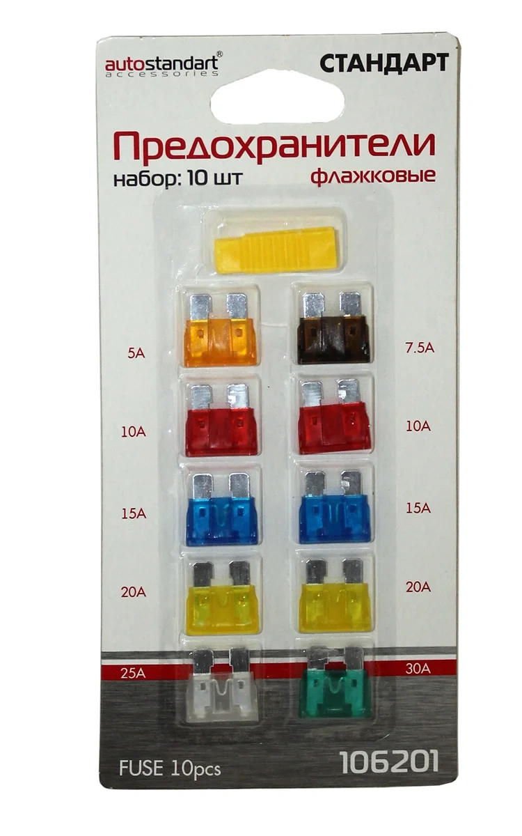 Штыри имеют заходные фаски для легкой установки. Коррозионностойкий сплав для надежной работы в суровых условиях. Корпус из специальной пластмассы, усиленной стекловолокном для увеличения формо и термоустойчивости. Цвет корпуса соответствует международным кодировочным стандартам. Плавкие вставки из высококачественного сплава цинка. Легкая визуальная идентификация сгоревшего предохранителя. Сила тока от 5 до 30А. Набор из 10 штук и пинцет для легкого извлечения перегоревшего предохранителя.