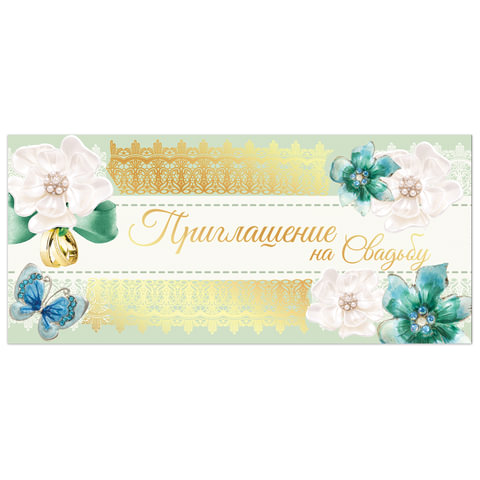 Изготовлено из высококачественного картона плотностью 215 г/м2. Выполнено в светло-зеленых оттенках с изображением цветов и обручальных колец, украшено золотистым декором. Для удобства предоставлен блок информации, куда можно вписать необходимые данные: адрес и время проведения торжества. Размер - 70х120 мм (в развороте 70х240 мм).