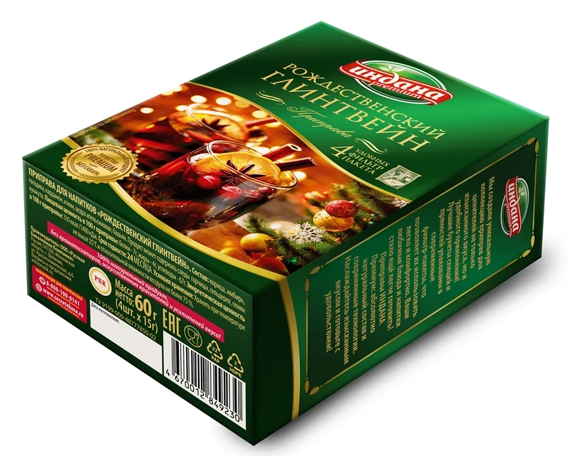 Натуральные специи в удобных фильтр-пакетах. Добавьте при приготовлении 1 фильтр-пакет на 0,5л сухого (или полусухого) красного вина или вишневого сока, 2-3 столовые ложки сахара (или мед по вкусу), 2-3 дольки апельсина. Крупные кусочки специй придают вину мягкий аромат и нежный вкус. Способ приготовления: возьмите одну бутылку красного вина, 100 грамм сахара и пакетик смеси для глинтвейна. Разогрейте вино, сахар и смесь приправ до 80С и оставьте на один час под крышкой. Для приготовления безалкогольного напитка возьмите вместо вина виноградный или вишневый сок.