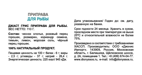 Приправа для рыбы Just Greece - разработана на основе традиционных рецептов греческой кухни. Специальная смесь пряностей, трав и сушеных овощей придаст рыбным блюдам неповторимый вкус и аромат. Рекомендации: смелите смесь на рыбу непосредственно перед приготовлением. Также рекомендуется для натирания (маринования) рыбу за 20-30 минут перед жаркой, тушением или запеканием.