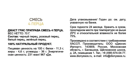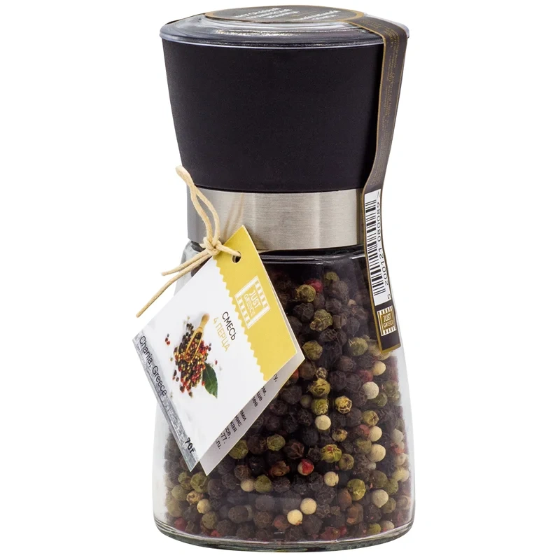 Премиальная смесь четырёх видов перца - белый, черный, зеленый, розовый. Для заправки салатов, горячих блюд, барбекю Приправа 4 перца является универсальной, ее можно добавлять к мясу, фаршу, колбасным изделиям, паштетам и рыбе, супу. Можно заправлять салаты, овощные и грибные блюда, яйца, а также первые блюда. Набор специй поставляется в стеклянной мельнице с керамическими ножами и регулируемым помолом - крупный /мелкий.
