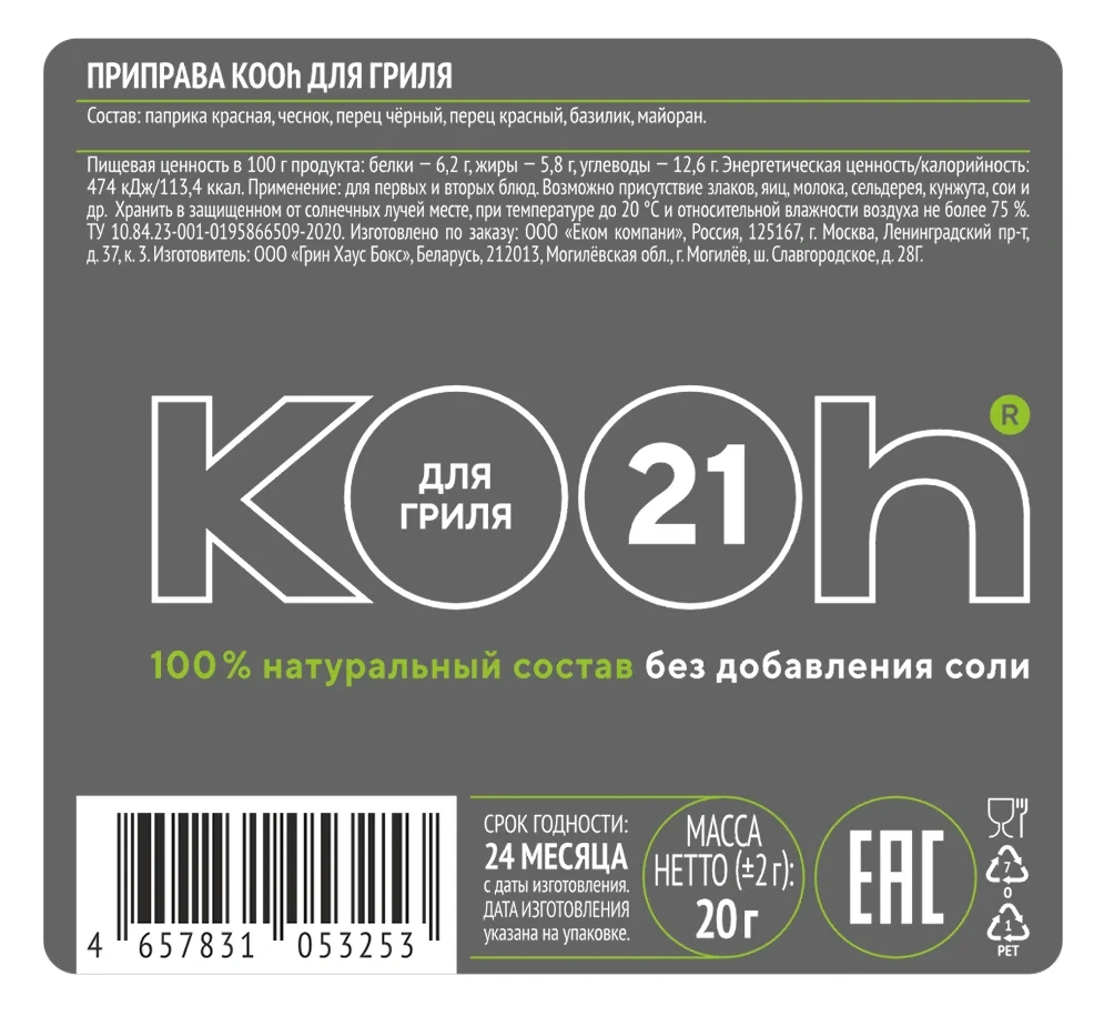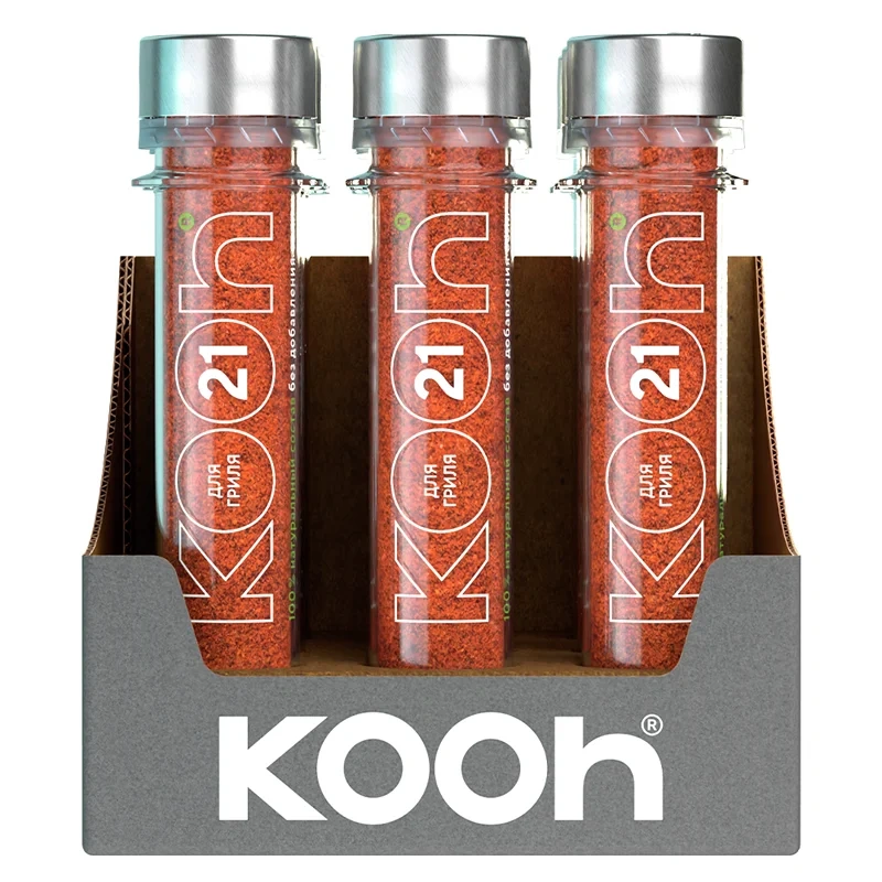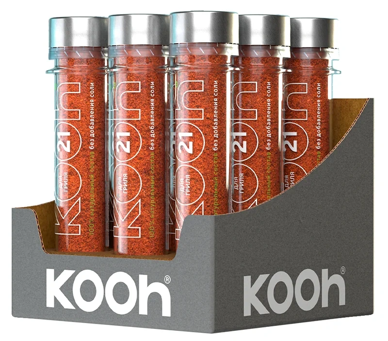 Приправа Kooh для гриля содержит 100% натуральный состав без добавления соли. Упакована в капсулы по 20 г. Смесь можно использовать как для приготовления маринадов, так и в сухом виде.