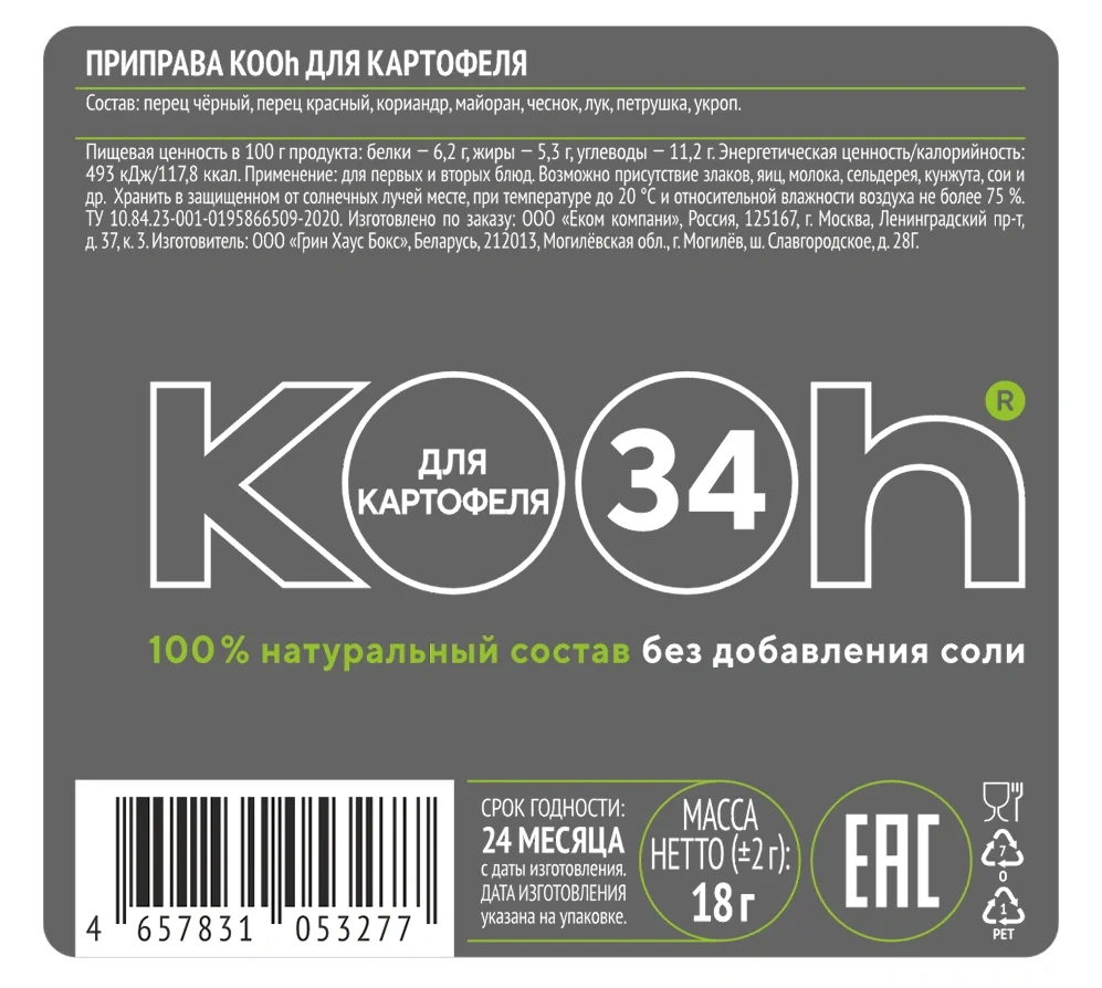Приправа Kooh для картофеля обладает 100% натуральным составом и не содержит добавленной соли. Упакована в капсулу объемом 18 г.