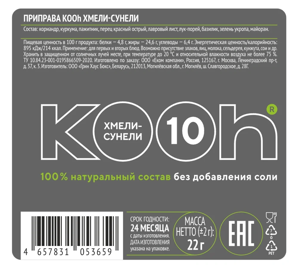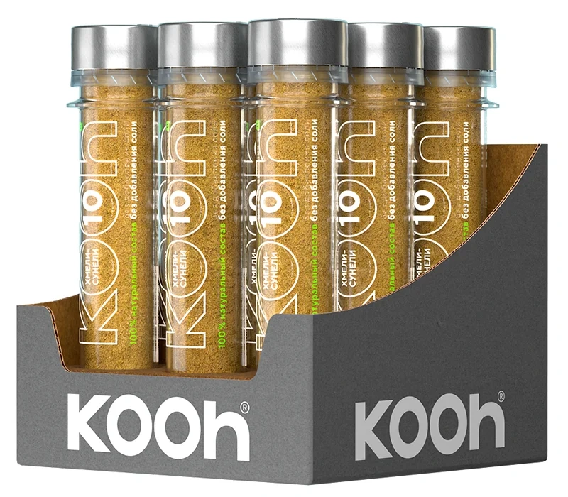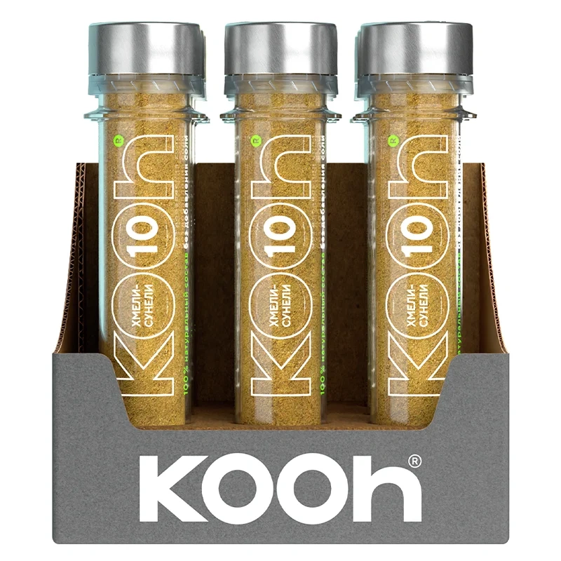 Приправа Kooh Хмели-сунели представляет собой традиционный грузинский купаж специй с кориандром, куркумой и душистыми травами. Обладает ярким пряным вкусом и ароматом, которые подчеркнут вкус мясных и вегетарианских блюд, а также идеально дополнят соусы домашнего приготовления.