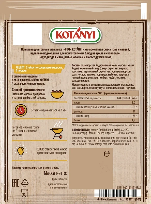 Приправа для гриля и шашлыка BBQ Kotanyi - это ароматная смесь трав и специй, идеально подходящая для приготовления блюд на гриле и сковороде. Подходит для мяса, рыбы, овощей и любых других блюд.