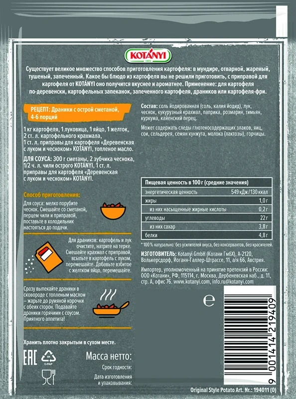 Существует великое множество способов приготовления картофеля: в мундире, отварной, жареный, тушеный, запеченный. Какое бы блюдо из картофеля вы не решили приготовить, с приправой Kotanyi оно получится вкуснее и ароматнее. Применение: для картофеля по-деревенски, картофельных запеканок, запеченного картофеля, драников или картофеля-фри.