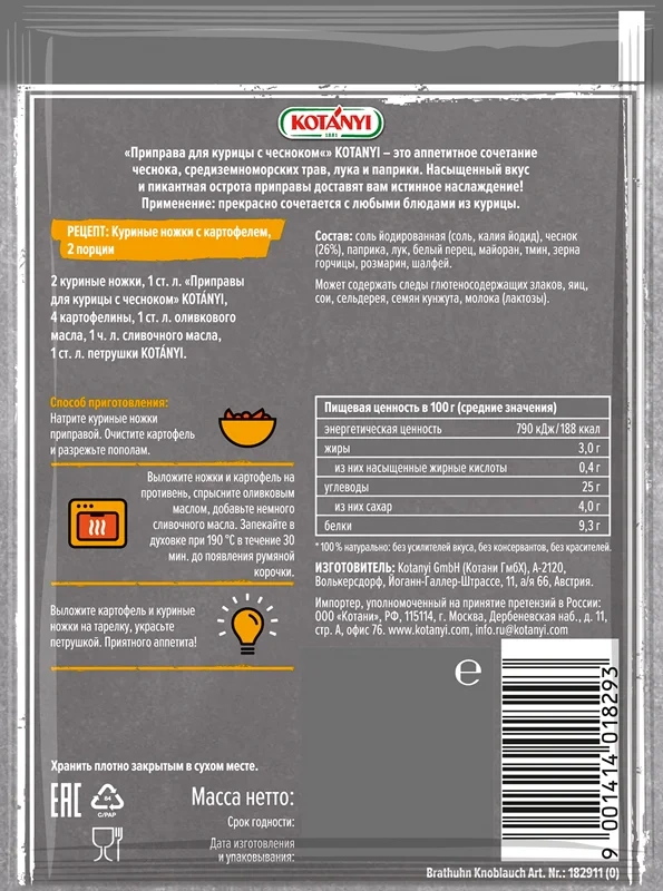 Приправа для курицы с чесноком Kotanyi, 30 г – аппетитное сочетание специй, в которых главную скрипку играет чеснок. Вы можете приготовить вкусную курочку без проблем, за считанные минуты. Для этого достаточно по вкусу добавить приправу в любой из моментов обжарки, тушения, запекания. В идеале – замариновать мясо, используя сбалансированный состав пачки и любой из соусов, к примеру, майонез, лимон, кефир, соевый. Далее вы можете обжаривать кусочки, запечь цыпленка в фольге в духовке, положить в жаровню и приготовить жаркое с овощами, сделать шашлык на гриле или шампурах. Такое мясо прекрасно сочетается с различными гарнирами, в том числе с гречкой, рисом, картофелем, макаронами или просто свежими овощами.