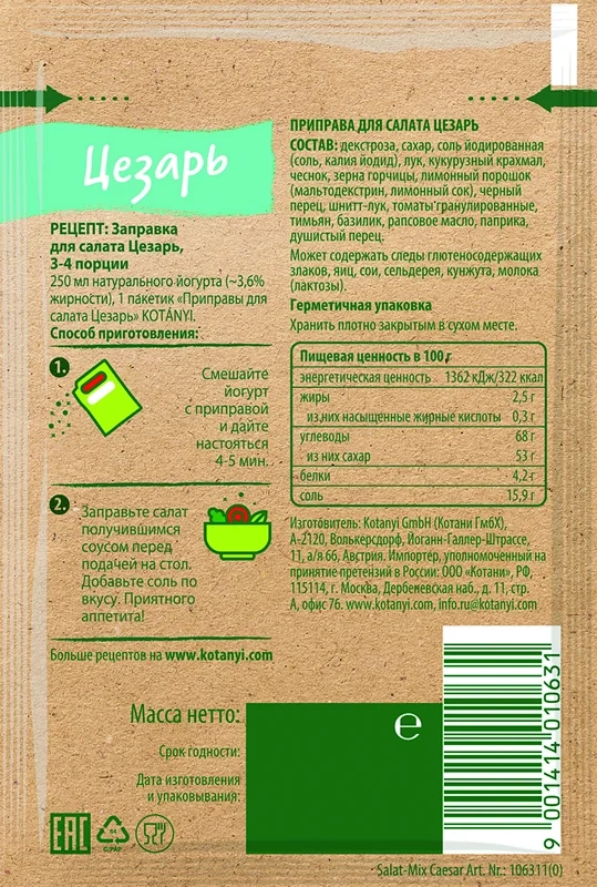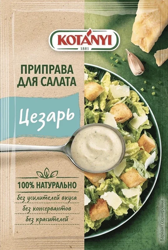 Приправа Kotanyi для салата Цезарь, 13 г поможет приготовить вам идеальный Цезарь без особенных усилий. Не секрет, что вкус этого популярного и многими любимого салата во многом зависит от того, насколько правильно был приготовлен соус. В оригинальном соусе содержится огромное количество ингредиентов, и далеко не все они есть в обычной кухне. Теперь вам не требуется покупать каждый по отдельности – просто смешайте порошок с натуральным йогуртом и заправьте блюдо.