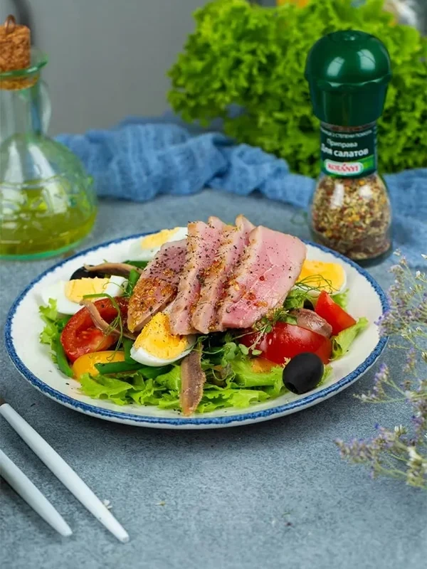 Приправа для салатов Kotanyi в мельнице, 40 г — это уникальное сочетание разнообразных специй в одной емкости. Продукт служит для придания готовому блюду пряного вкуса и насыщенного, пикантного аромата. Приправа идеально подходит для овощных блюд, гарниров, салатов и к стейку из куриной грудки. Она заключена в прозрачную компактную мельницу эргономичной формы, которая удобно располагается в ладони. В соответствии с индивидуальными предпочтениями можно выбрать степень помола — и всего в одно движение добавить измельченные специи на готовое блюдо. Приправа поможет улучшить аппетит и сделает каждый прием пищи запоминающимся. С ее помощью можно изменить, усилить и оттенить вкус любимых блюд.