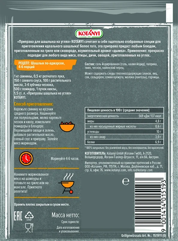 Приправа Kotanyi для гриля шашлык на углях, 30г — это отличный способ разнообразить привычное блюдо. Ею можно натирать мясо перед приготовлением или добавлять прямо перед подачей, результат всегда один — тонкий, нежный аромат трав, насыщенный вкус, волнующее послевкусие. Приправа хороша как в самостоятельном виде, так в комбинации с другими специями — базиликом, сушеным луком или чесноком. Миксуя разные сочетания, можно каждый раз получать новые вкусы. Приправа подходит также для соусов и подлив к шашлыку, щепотку можно добавить и в гарнир. Небольшую упаковку-саше удобно хранить на кухне, а также брать с собой на дачу и просто на природу. Хранить продукт рекомендуется в сухом и прохладном месте, вдали от источников тепла и прямых солнечных лучей. На этикетке указана дата изготовления.
