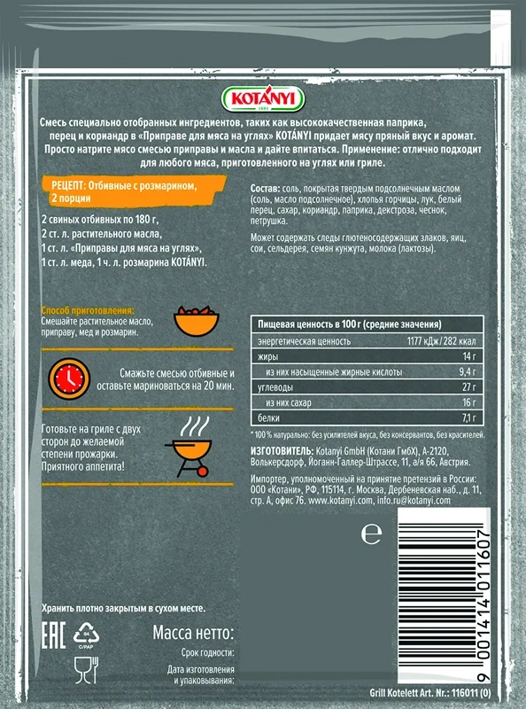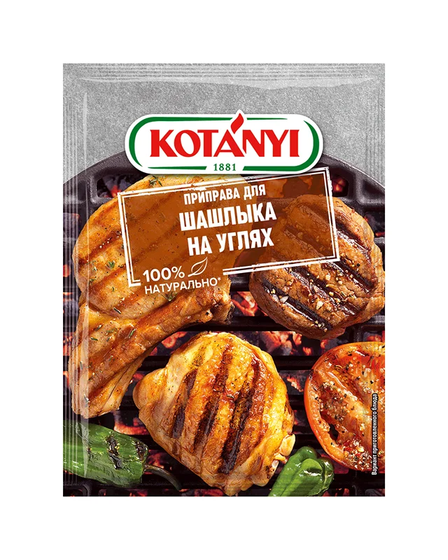 Приправа Kotanyi Мясо на углях, 30 г состоит качественно подобранных ингредиентов, которые придают мясу приятный вкус и аромат дымка. Специя подходит для любого мяса, приготовленного на углях. В составе продукта есть натуральный краситель Е160с, который также используется для окрашивания маргаринов, майонезов, соусов на жирной основе, кроме этого краситель может добавляться в состав апельсиновых соков, конфет. Маслосмолы паприки относится к категории безопасных для здоровья человека красителей, так как добывается из растений.