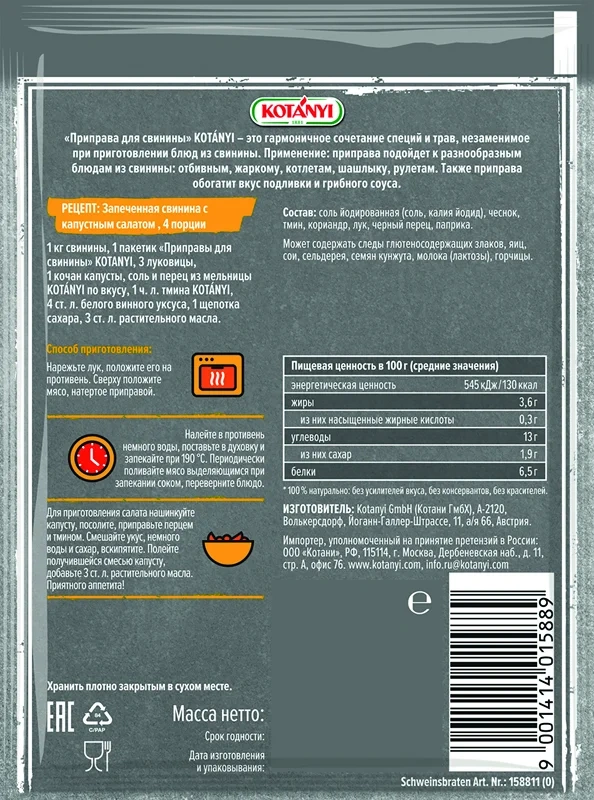 Приправа Kotanyi для свинины, 30 г – это смесь трав и специй, которая дарит любому блюду оригинальный вкус и приятный аромат. В состав входят натуральные ингредиенты. Приправа отлично подойдет к отбивным, жаркому, котлетам, шашлыку, рулетам. Также смесь подарит насыщенный вкус подливке и грибному соусу. Она придется по вкусу как взрослым, так и детям.