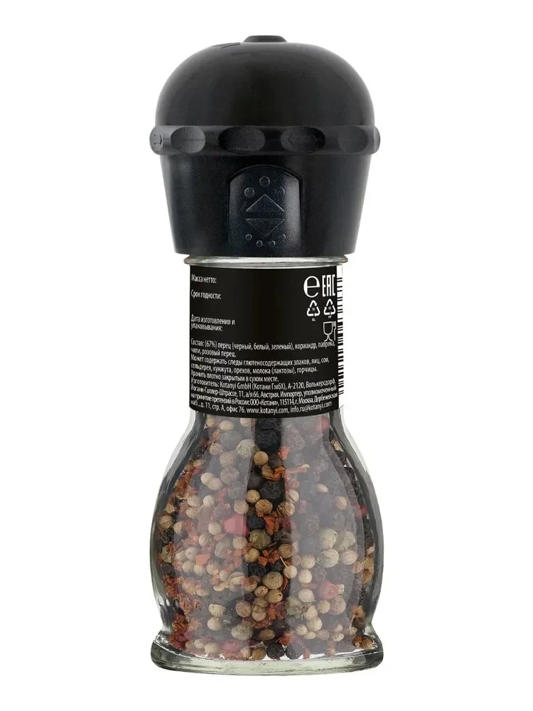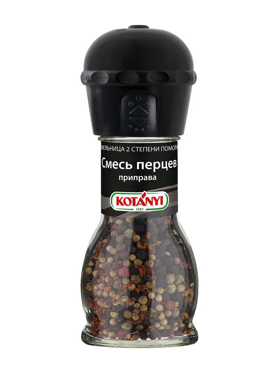Это композиция черного, зеленого и белого перца с кориандром или перцем чили для изысканного пряного вкуса. Смесь перцев - идеальная приправа практически для любого блюда. С такой удобной мельницей вы сможете по достоинству оценить все преимущества приправы. Пластиковый механизм на крышечке имеет две степени помола. Чтобы выбрать крупный, переверните мельницу и опустите механизм до щелчка. Чтобы использовать мелкий помол, поднимите механизм по стрелочкам. Подходит для сервировки стола.