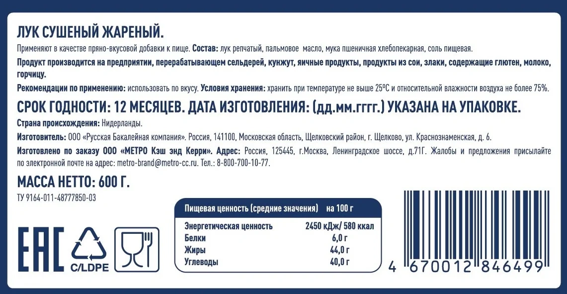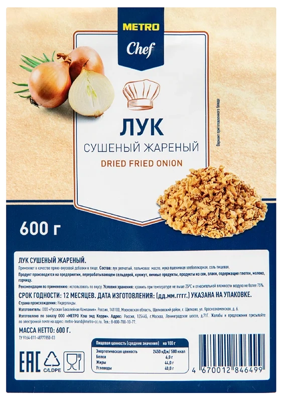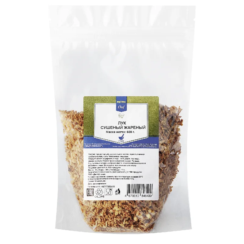 METRO Chef Лук жареный, 600г – универсальная добавка для разнообразных блюд, которая получается из нарезанного и подсушенного лука, обжариваемого с добавлением чистого растительного масла. После специальной обработки из него делают специю. Зачастую он входит в состав продуктов быстрого приготовления, например, картофельного пюре, разнообразных каш и супов. Также эта приправа широко используется в изготовлении хлебобулочных изделий. Повышенные ароматические свойства позволяют добавлять жареный лук в соусы и кетчупы, где он становится важным ингредиентом.