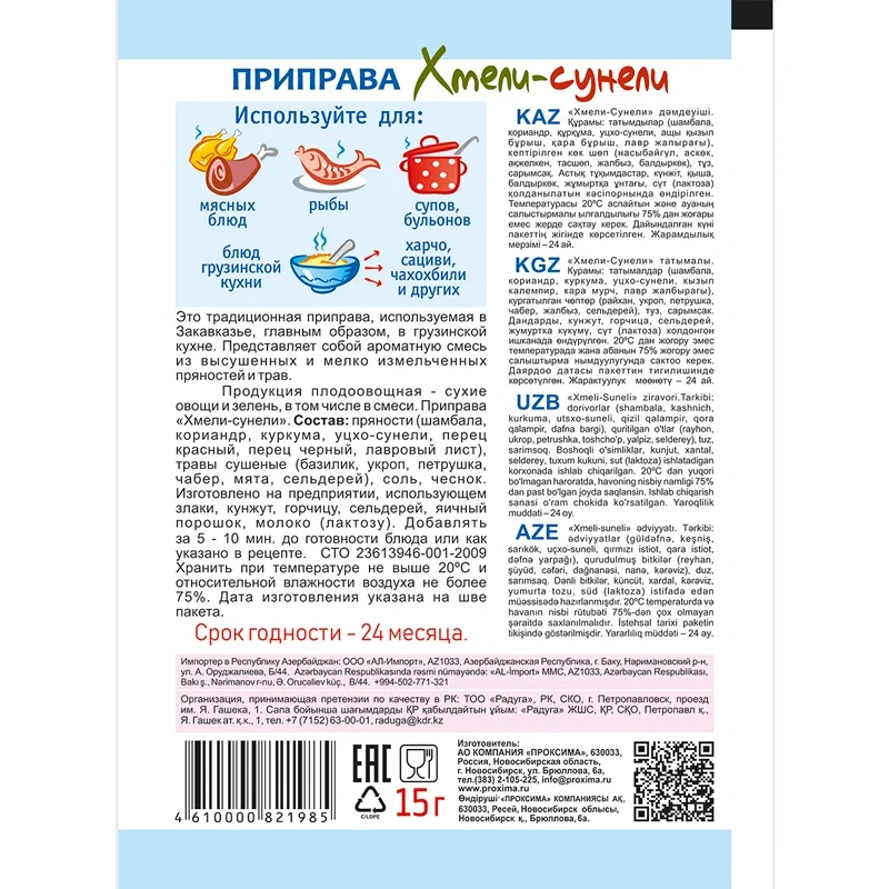 Это традиционная приправа, используемая в Закавказье, главным образом, в грузинской кухне. Это пряная, но не острая смесь специй и высушенных пряных трав, придаст вашим блюдам характерный аромат и вкус. Хмели-сунели является идеальной приправой для блюд из говядины, свинины, баранины, курицы, рыбы, для мясных супов, бульонов и подливок. Используется в таких блюдах, как харчо, чахохбили, сациви и другие.