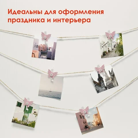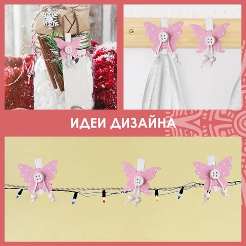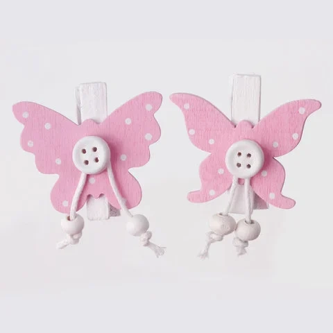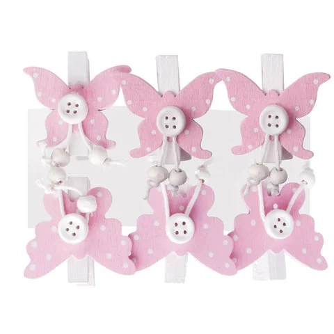 Изготовлены из дерева. Имеют классическую форму с фигурным топпером в виде бабочек с декоративными элементами. Выполнены в розовом цвете. Длина прищепки - 3,5 см. Предназначены для детей старше 3-х лет. Поставляются в пакете с европодвесом в количестве 6 штук.