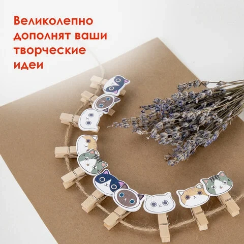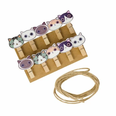 Прищепки декоративные 'Котики', 10 штук, 3,5 см, ассорти, со шпагатом, ОСТРОВ СОКРОВИЩ, 662673