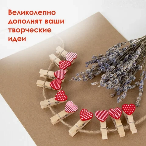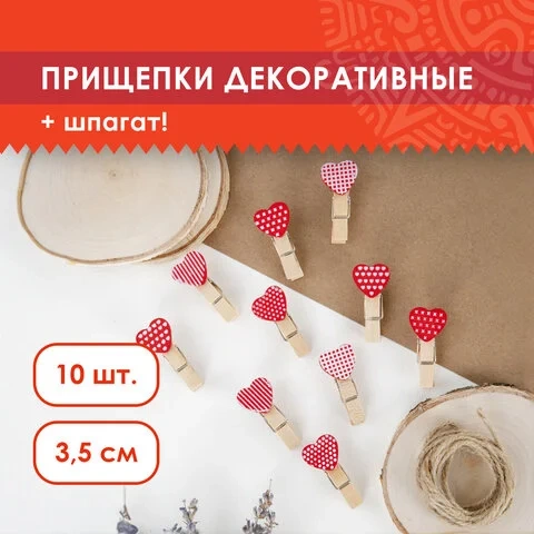 Прищепки декоративные 'Сердечки', 10 штук, 3,5 см, ассорти, со шпагатом, ОСТРОВ СОКРОВИЩ, 662674