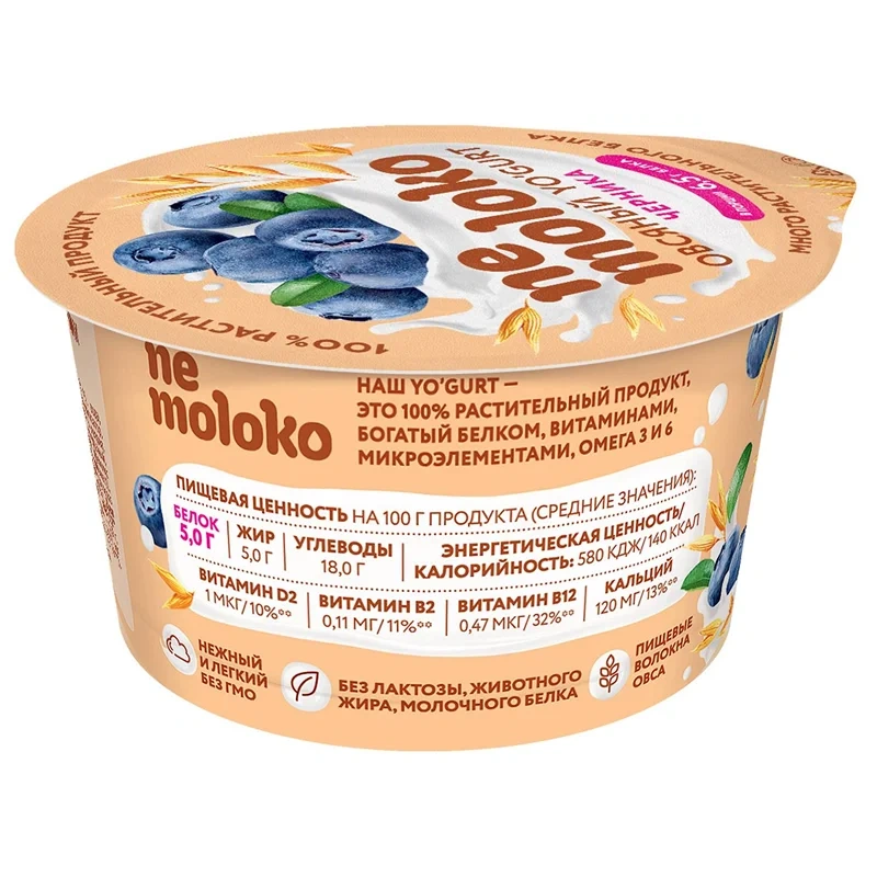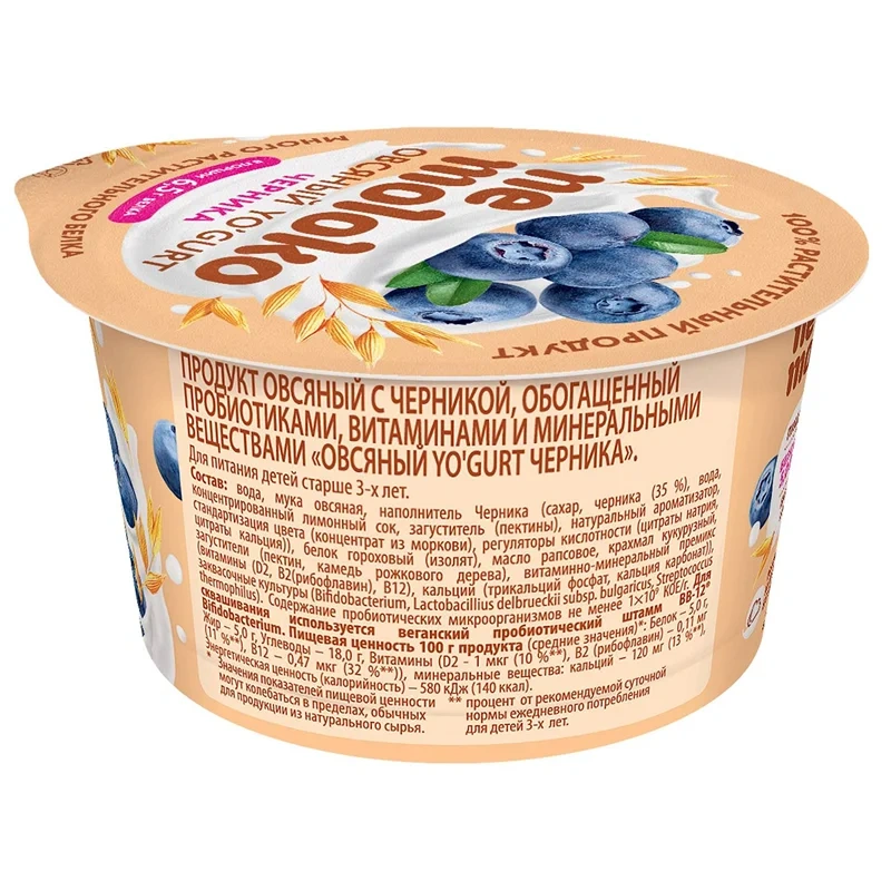 Yo'gurt овсяный с черникой – это растительная альтернатива традиционным йогуртам с ягодами. Рецептура йогурта с пробиотиками разработана и подобрана так, чтобы продукт имел привычный вкус, консистенцию, обладал полезными свойствами и оставался при этом 100% растительной альтернативой. В состав входят высококачественные ягоды, которые проходят минимум переработки. Теперь вариантов вкусного и полезного перекуса стало еще больше. Наши кислоНЕмолочные продукты содержат живые культуры полезных бактерий, именно поэтому срок их хранения не более 40 дней. Микрофлора бактериальных культур и заквасок, используемых для сквашивания кислоНЕмолочных продуктов Nemoloko, культивируется исключительно на растительной основе и не содержит продуктов животного происхождения. Пробиотик это класс микроорганизмов, который нормализует микрофлору кишечника и укрепляет иммунитет. Использование в рационе питания продуктов, которые содержат полезные живые бактерии, один из способов восстановить микрофлору кишечника естественным путём.