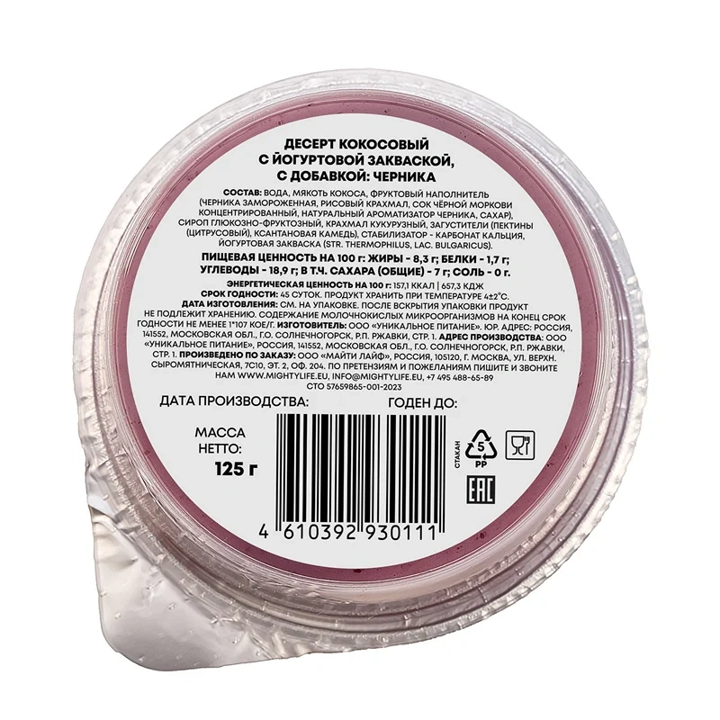 Вода, мука овсяная, наполнитель Черника сахар, черника 35%, вода, концентрированный лимонный сок, загуститель пектины, натуральный ароматизатор, стандартизация цвета концентрат из моркови, регуляторы кислотности цитраты натрия и кальция, белок гороховый изолят, масло рапсовое, крахмал кукурузный, загустители пектин и камедь рожкового дерева, витаминно-минеральный премикс (витамины D2, B2 рибофлавин, B12), кальций трикальций фосфат, кальция карбонат, заквасочные культуры: Bifidobacterium, Lactobacillus delbrueckii subsp. bulgaricus, Streptococcus thermophilus.