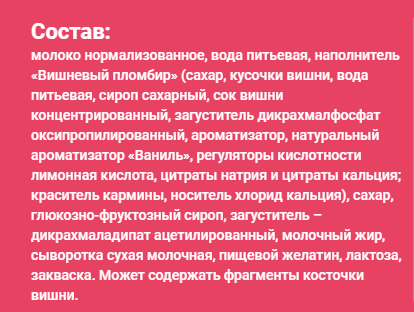 Молоко нормализованное, вода питьевая, сахар, глюкозно-фруктозный сироп, загуститель дикрахмаладипат ацетилированный, сыворотка сухая молочная, наполнитель (концентрированный сок персика, вода питьевая, ароматизаторы, загуститель дикрахмалфосфат оксипропилированный, красители каротины и кармины; регулятор кислотности цитраты натрия), желатин пищевой, закваска.