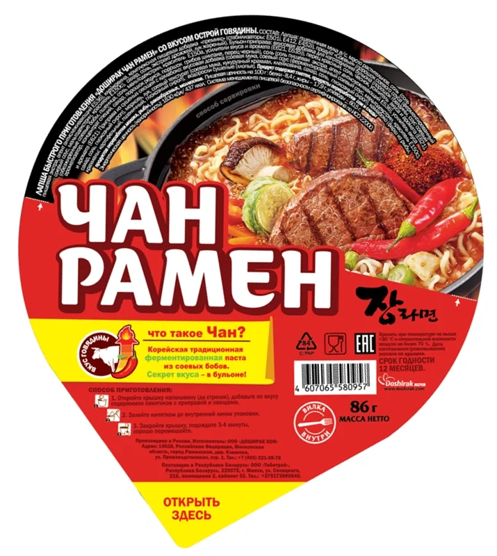 Лапша быстрого приготовления Доширак Суп чан рамен с острой говядиной, 86г