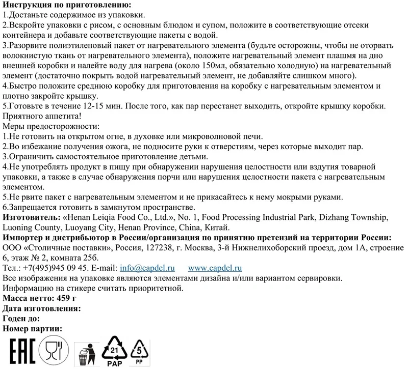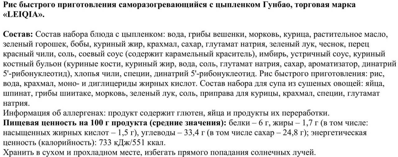 Рис быстрого приготовления Lei Qia саморазогревающийся цыпленок гунбао, 459г