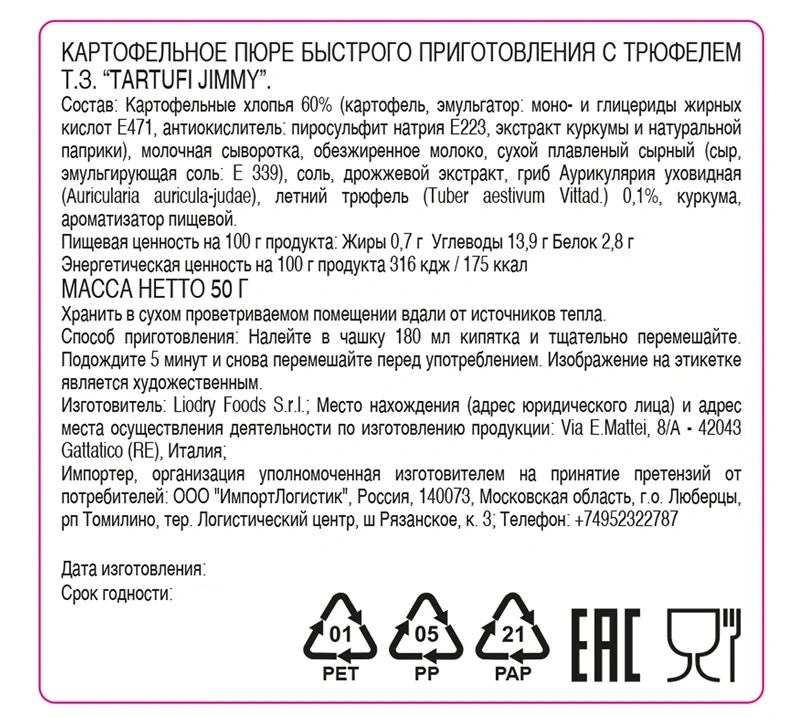 Пюре картофельное быстрого приготовления Tartufi Jimmy с трюфелем, 50г