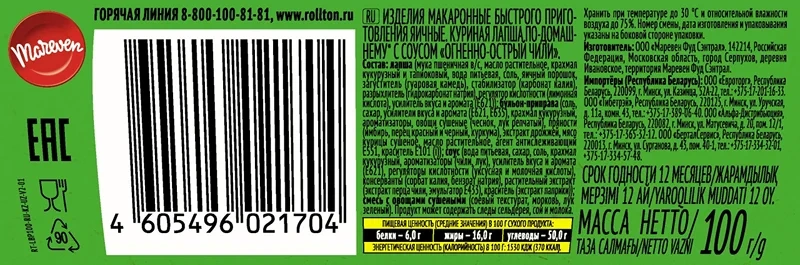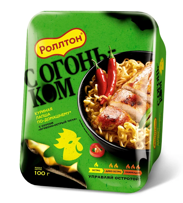 Лапша быстрого приготовления Роллтон куриная с соусом чили, 100г