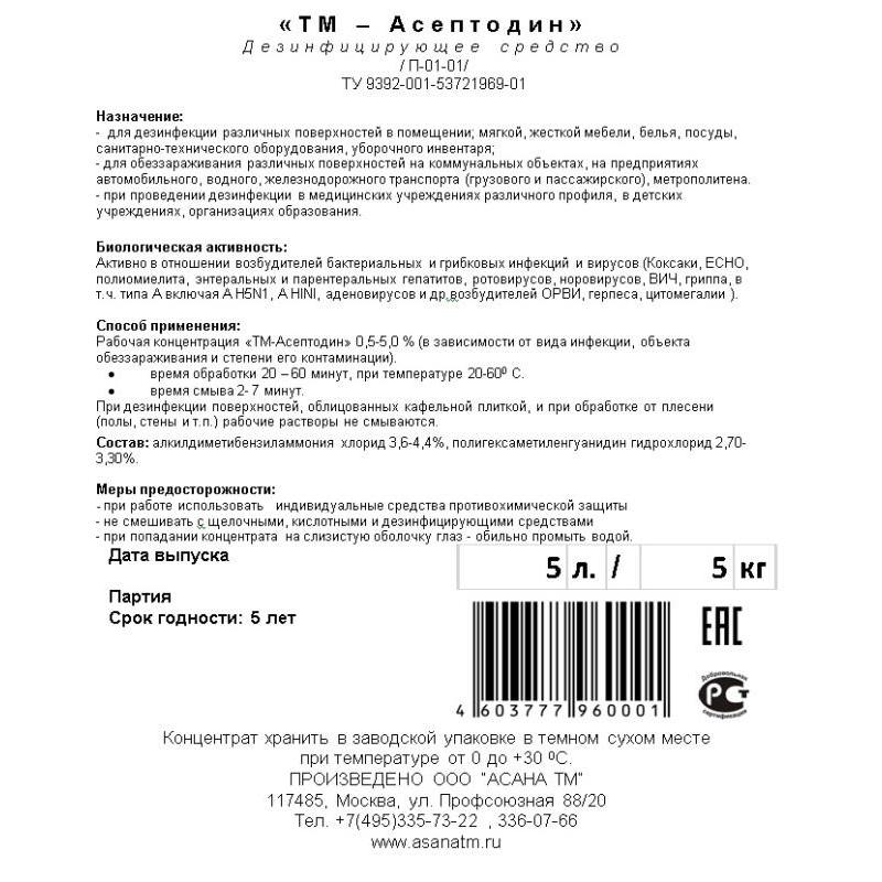 Способ применения: рабочая концентрация ТМ-Асептодин 0.4-5.0 % (в зависимости от вида инфекции, объекта обеззараживания и степени его контаминации), время обработки 20-60 минут, при температуре 10-40°С. Время смыва 2-7 минут, при контакте с пищевыми продуктами.