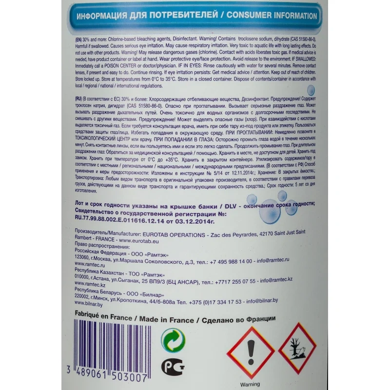 Профхим дезинфек табл ХЛОР д/поверхн Evrotab/Жавель Солид, 320шт/уп, 1кг Дезинфицирующее средство Жавель Солид N320 1 кг (320 таблеток) Назначение: предназначено для обеззараживания поверхностей в помещениях, жесткой мебели, санитарно-технического оборудования, наружных поверхностей приборов и аппаратов, посуды, в том числе лабораторной (включая однократного использования), аптечной, предметов для мытья посуды, предметов ухода за больными, средств личной гигиены, белья, уборочного инвентаря, крови, в том числе забракованной и крови с истекшим сроком годности, ликвора, выделений (мокрота, рвотные, фекальные массы, моча), смывных жидкостей (эндоскопические, после ополаскивания зева и др.), остатков пищи, уборочного инвентаря, медицинских отходов из текстильных и других материалов (перевязочный материал, ватно-марлевые салфетки, тампоны, медицинские изделия однократного применения и белье одноразовое перед утилизацией), игрушек, резиновых и пропиленовых ковриков, обуви из резин, пластмасс и других полимерных материалов при проведении профилактической, текущей и заключительной дезинфекции в медицинских организациях, аптеках, клинических, бактериологических, вирусологических и др. диагностических лабораториях, пунктах и станциях переливания и забора крови, на санитарном транспорте, в инфекционных очагах, при чрезвычайных ситуациях, - для проведения профилактической дезинфекции систем мусороудаления (мусороуборочное оборудование, инвентарь, мусоросборники, мусоровозы), на предприятиях коммунально-бытового обслуживания (гостиницы, общежития, парикмахерские, массажные и косметические салоны, солярии, сауны, салоны красоты, бани, прачечные, общественные туалеты), в торговых, развлекательных центрах, на предприятиях общественного питания и торговли (рестораны, бары, кафе, столовые), продовольственных и промышленных рынках, в учреждениях образования, культуры, отдыха, объектах курортологии, спорта (бассейны, санпропускники, культурно-оздоровительные комплексы, спорткомплексы, кинотеатры, музеи и др.), в учреждениях пенитенциарных, социального обеспечения (дома для инвалидов, престарелых и др.), в войсках, для заключительной дезинфекции в детских учреждениях, на подвижном составе и объектах обеспечения всех видов транспорта (железнодорожного, автомобильного, морского, речного, городского транспорта, в т.ч. на метрополитене), в помещениях вокзалов, станций, аэровокзалов и других объектах пассажирского хозяйства, в условиях чрезвычайных ситуаций, на объектах общественной обороны. Для проведения генеральных уборок. Для дезинфекции изделий медицинского назначения из коррозионностойких металлов, резин, пластмасс, стекла. Для обеззараживания поверхностей, пораженных плесневыми грибами, Способ применения: при обработке поверхностей при бактериальных и вирусных инфекциях концентрация рабочих растворов средства (по активному хлору) должна составлять не более 0,015% при времени экспозиции не более 60 минут, при туберкулезе - не более 0,2% при времени экспозиции не более 60 минут, при грибковых инфекциях - не более 0,06% при времени экспозиции не более 60 минут и не более 0,1% при времени экспозиции не более 30 минут, при контаминации спорами бацилл - не более 1,0 % при времени экспозиции не более 90 минут, при дезинфекции ИМН - не более 0,3 % при времени эк