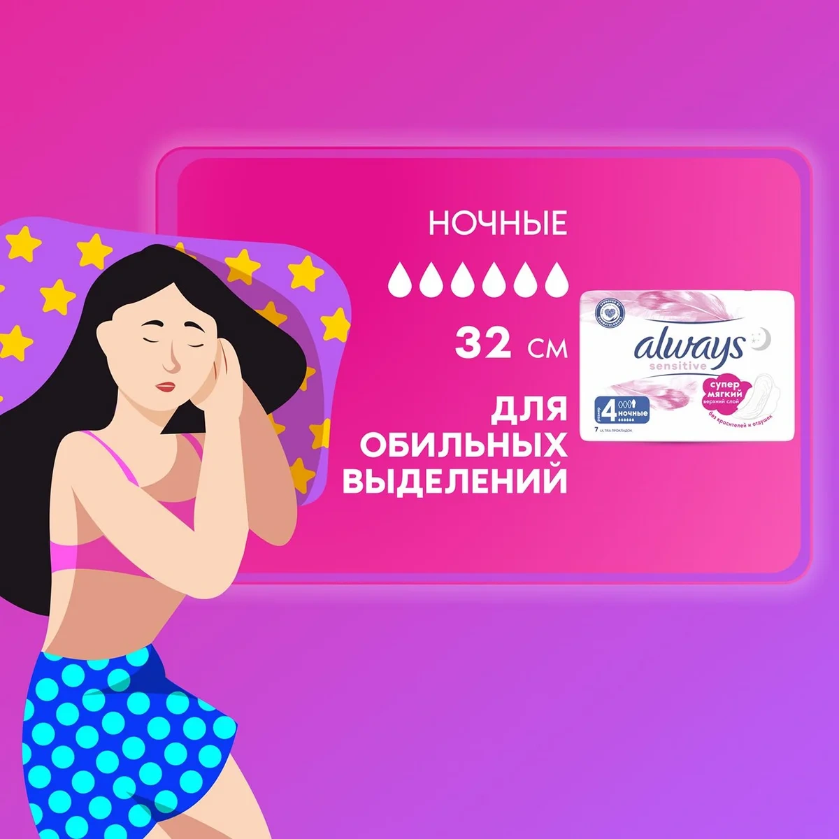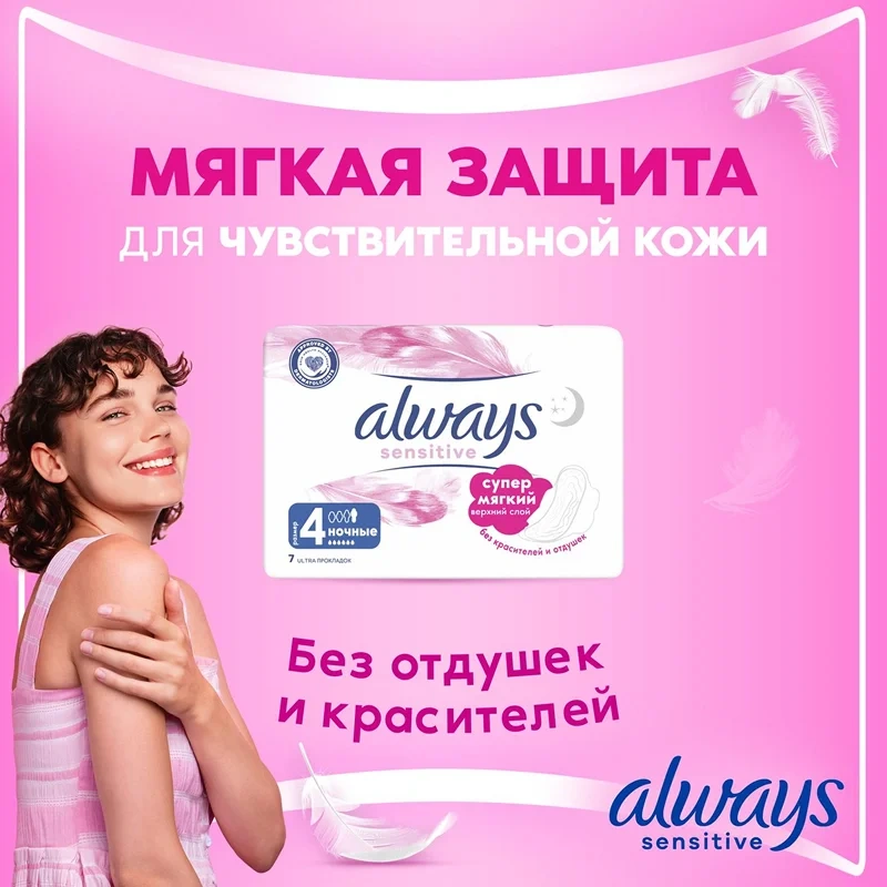 Это мягкая защита для чувствительной кожи. Они обладают супер мягким верхним слоем, а также не содержат отдушек и красителей. Специальные крылышки обеспечивают дополнительную боковую защиту и помогают удерживать прокладку на месте. Прокладки рекомендованы для лучшей защиты в ночное время и идеально подходят для обильных выделений. Идеально подходят для использования ночью или при обильных выделениях. С крылышками, которые обеспечивают дополнительную боковую защиту и помогают удерживать прокладку на месте.
