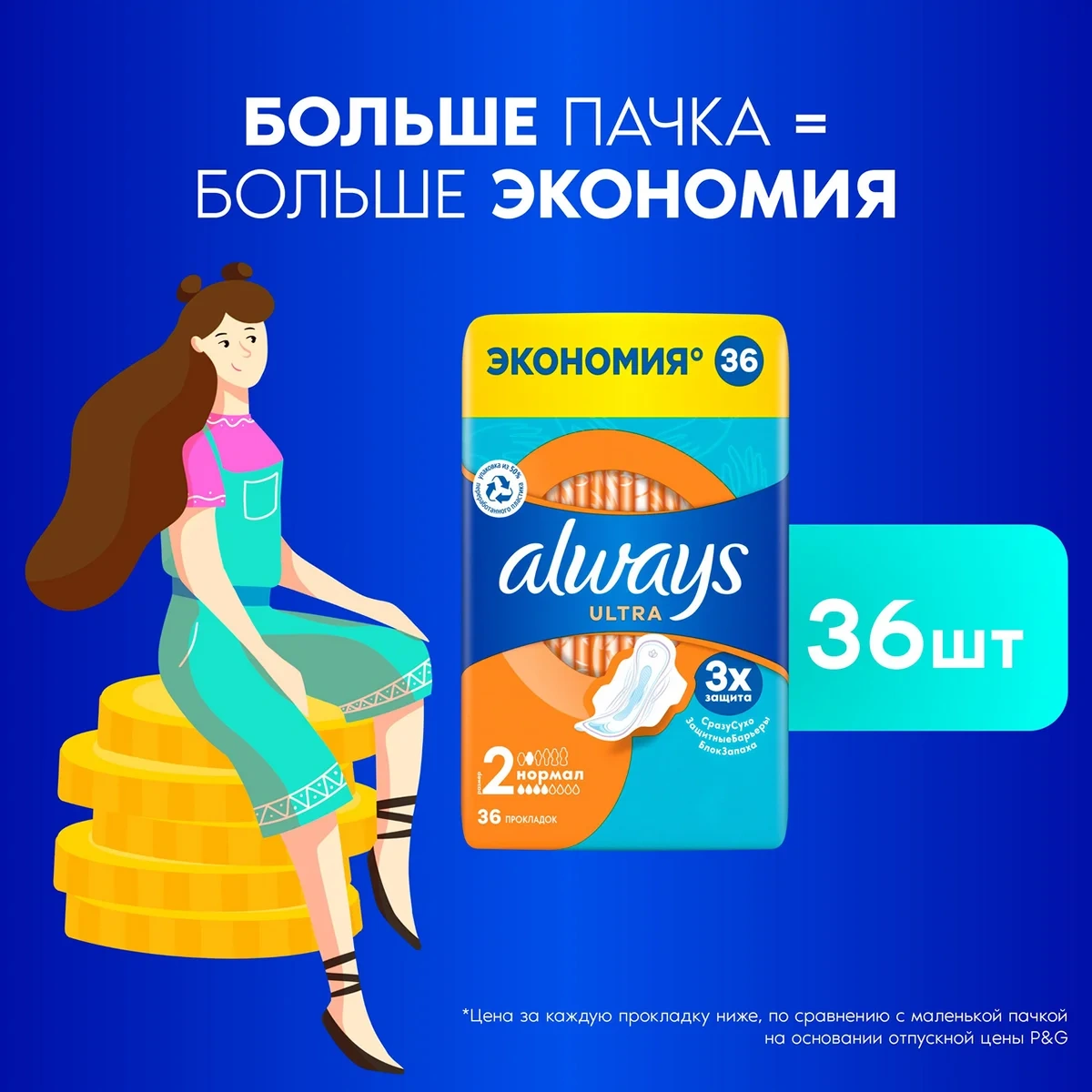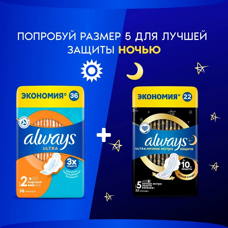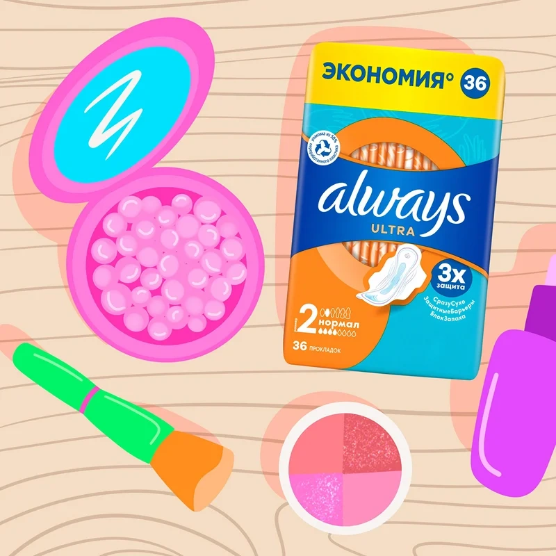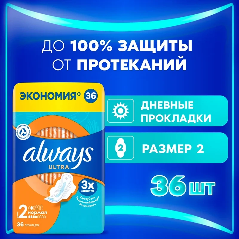 Тройная защита от Always- не соглашайтесь на меньшее: в Always Ultra Normal (Размер 2) с крылышками используется новейшая технология для создания многофункциональной гигиенической прокладки с 3 элементами защиты. Система Сразу сухо впитывает влагу за считаные секунды и не дает ей соприкасаться с кожей. Технология Защитные барьеры удерживает жидкость, предотвращая протекания. Технология Блок запаха нейтрализует неприятные запахи, придавая ощущение свежести и чистоты во время менструации. С Always Ultra вы можете чувствовать себя уверенно весь день. Тройная защита от Always— не соглашайтесь на меньшее. Формула дерматологически одобрена Ассоциацией здоровья кожи (Skin Health Alliance). Попробуйте Always Ultra Secure Night Extra с крылышками- лучшие гигиенические прокладки Always для защиты в ночное время. Обеспечьте себе наилучшую защиту с помощью Always My Fit— специальной системы определения размера, которая помогает правильно подобрать прокладку ALWAYS на основании количества выделений и размера трусиков. Супервпитывающий внутренний слой с системой Сразу сухо, которая впитывает жидкость за считаные секунды. Технология Защитные барьеры удерживает жидкость, предотвращая протекания. Технология Блок запаха нейтрализует неприятные запахи. Гигиенические прокладки не раздражают кожу (доказано дерматологами). Крылышки помогают удерживать прокладку на месте для надежной защиты и ощущения комфорта.