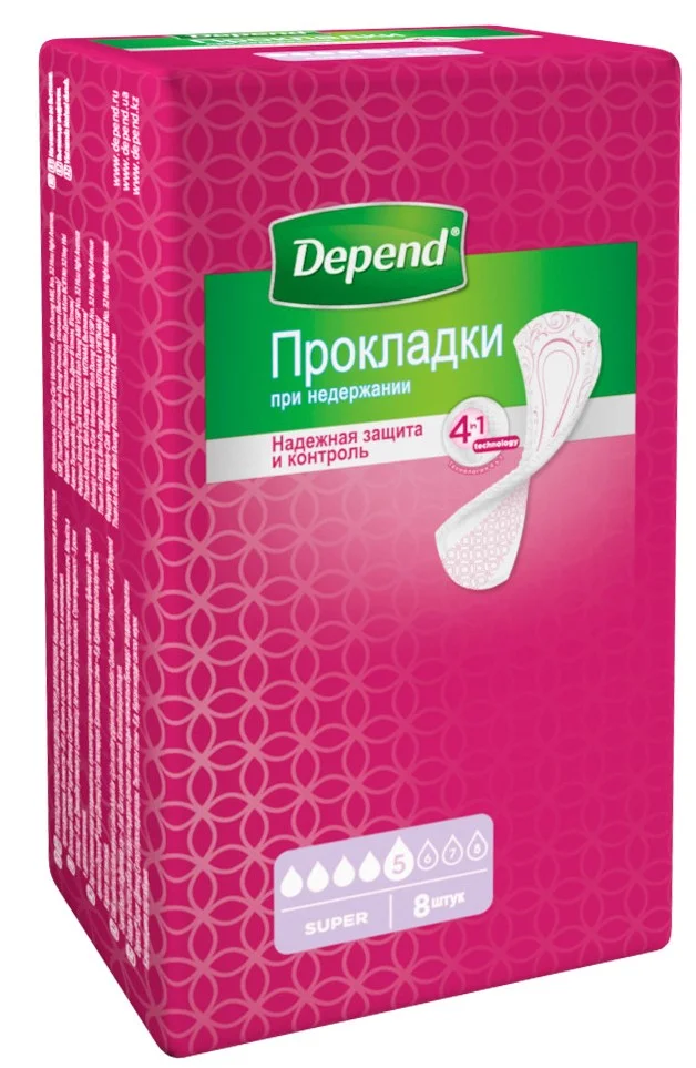 Урологические прокладки Depend Super для женщин, 8 шт. Новые прокладки Depend Super* созданы специально для защиты при капельной и легкой степени недержания. Технология 4 в 1. Надежная защита и контроль.Преимущества: Полный контроль над протеканием. Специальная форма с боковыми бортиками Leak-Block (Лик-Блок) для максимальной защиты от протекания. Максимальная сухость. Обеспечивает сухость в 3 раза дольше, чем обычная прокладка. Быстрое впитывание. Быстро впитывающий слой для максимальной защиты и комфорта. Контроль над запахом. Абсорб-Лок быстро впитывает влагу и удерживает запах.