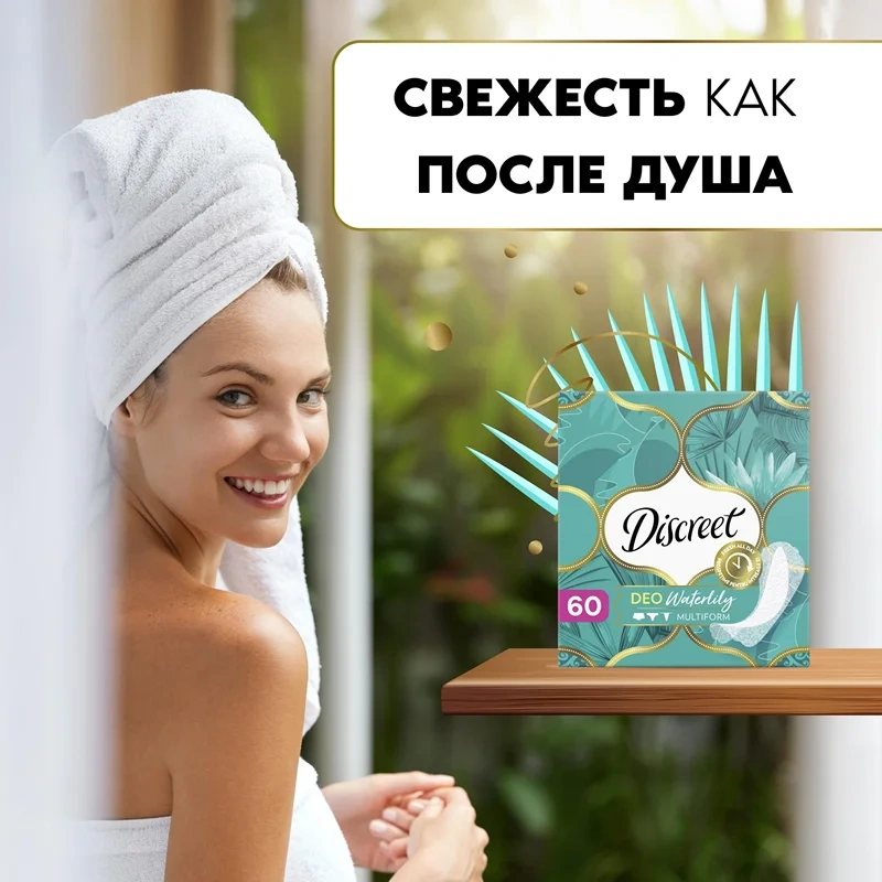 Ежедневные гигиенические прокладки Discreet Multiform Водная лилия не только дарят ощущение свежести, но и помогают всем девушкам чувствовать себя красивыми! Эти ежедневные гигиенические прокладки позволяют коже дышать, обеспечивая свежесть и комфорт до 12часов. Они настолько тонкие, что вы их даже не почувствуете, и, кроме того, их особая форма подойдет для любого белья. Фирменный аромат водной лилии дарит ощущение свежести и женственности. С этими прокладками вы будете ощущать свежесть в течение всего дня, в любой ситуации! - Фирменный аромат водной лилии - До 12 часов свежести, чтобы ничто не мешало вам чувствовать себя красивой - Тоньше 1 мм — вы их даже не почувствуете - Тонкие и гибкие ежедневные гигиенические прокладки, повторяющие каждое ваше движение - Клейкая прослойка от края до края фиксирует прокладку на вашем белье в течение всего дня - Дышащие ежедневные гигиенические прокладки - 4 гибкие зоны для трусиков любой формы.