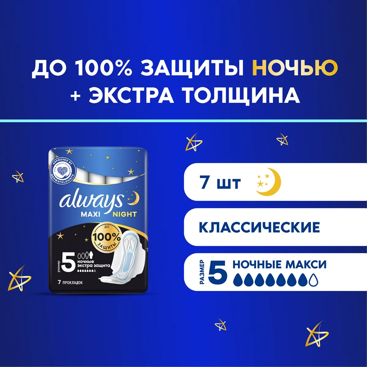Гигиенические прокладки Always Maxi Normal обеспечивают защиту и комфорт, когда вам это необходимо больше всего. Гигиеническая прокладка Always Maxi Night – это прокладка с дополнительной толщиной, которая обеспечивает до 100% защиты благодаря своим защитным барьерам от протекания по всей поверхности и дополнительному впитывающему внутреннему слою в центре. - Гигиенические прокладки, обеспечивающие до 100% защиты. - Защитные барьеры от протекания по всей поверхности. - Ультравпитывающий внутренний слой. - Комфортный верхний слой. - Одобрены дерматологами Ассоциации здоровья кожи (Skin Health Alliance).