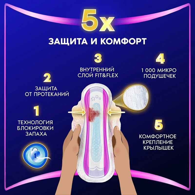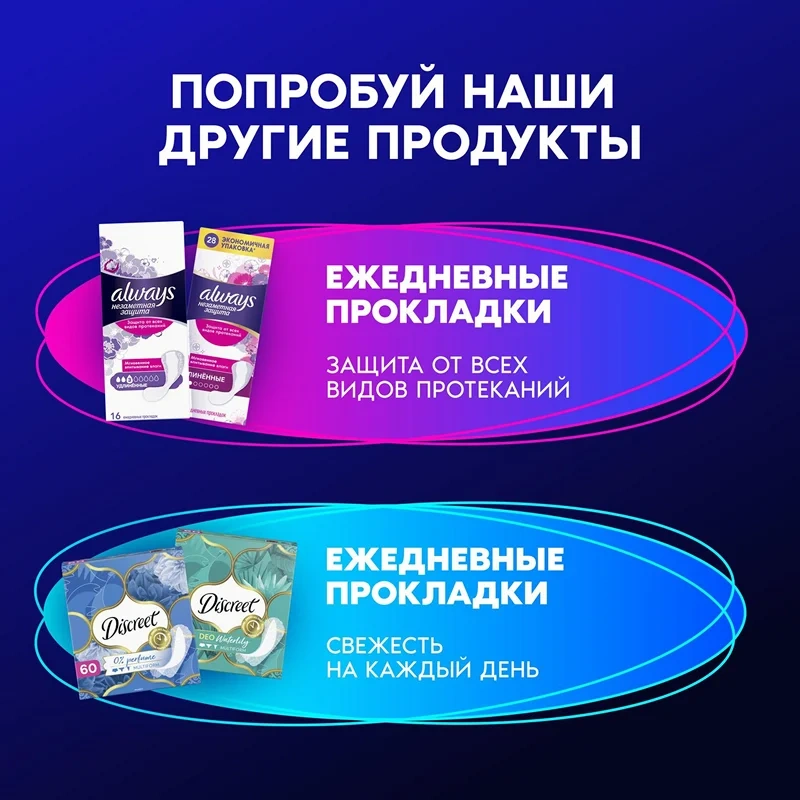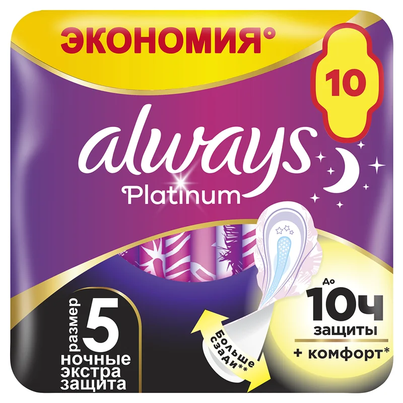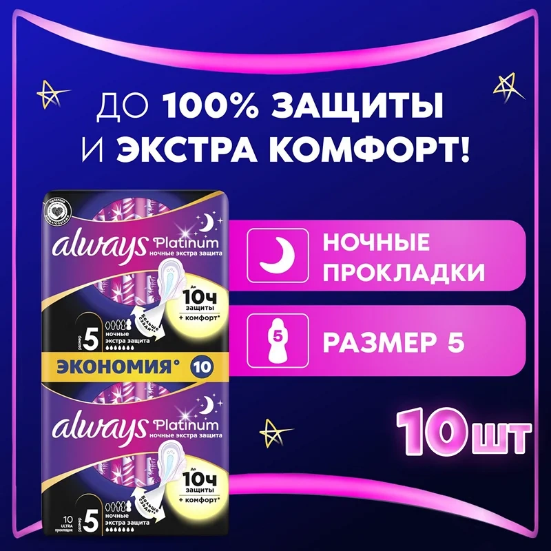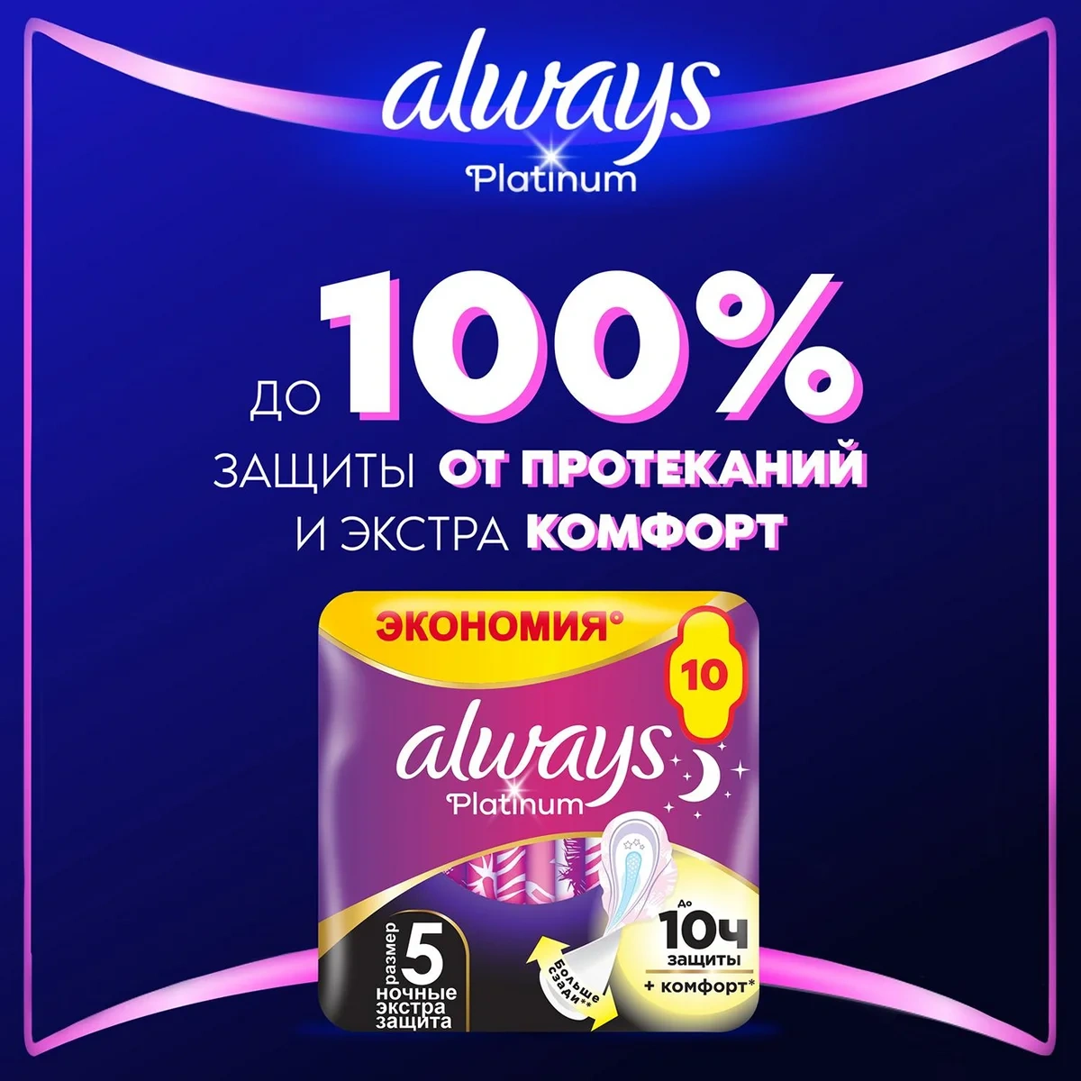 Гигиенические прокладки Always Platinum обеспечивают лучшее сочетание комфорта и защиты среди прокладок Always. Always Platinum более комфортны (по сравнению с Always Ultra) благодаря тысячам микроподушечек и новым, мягким как шелк крылышкам. Они также обеспечивают лучшую защиту (по сравнению с Always Ultra) благодаря защитным боковым барьерам и ультравпитывающему внутреннему слою, который запирает влагу внутри. Always Platinum Secure Night (Размер 5) с крылышками рекомендованы для ночного использования, благодаря удлиненной на 60% задней части (по сравнению с Always Platinum Размер 2). Попробуйте Always Platinum Long (Размер 2) для дневного использования при умеренных выделениях.