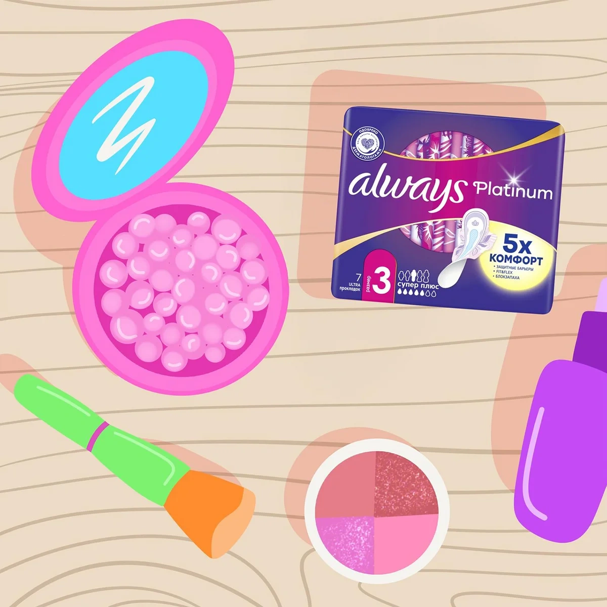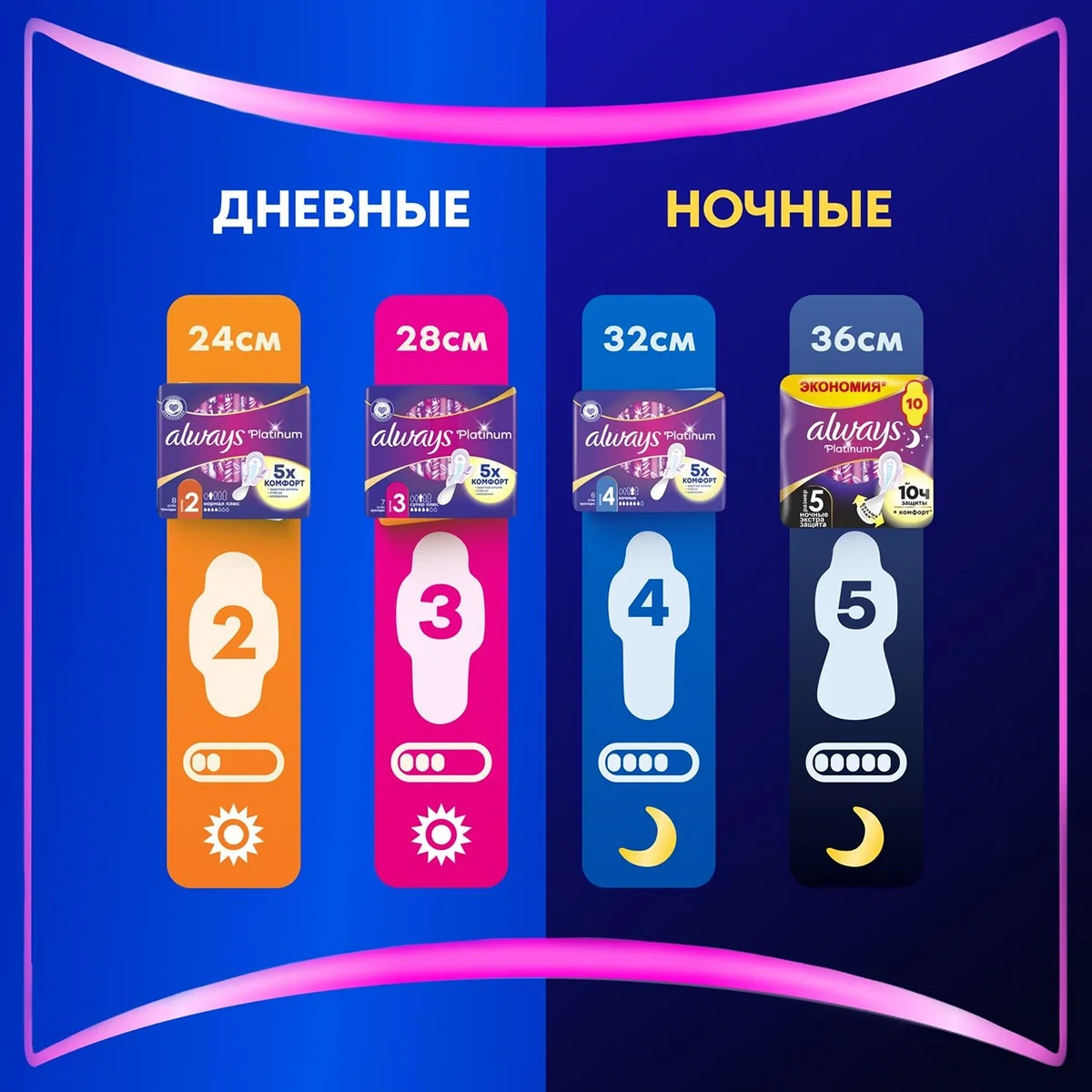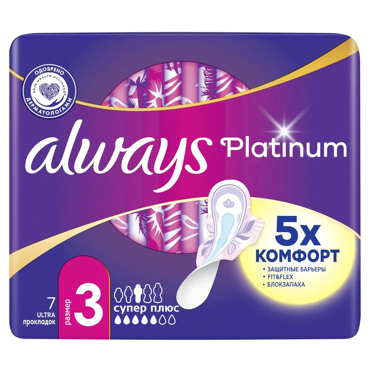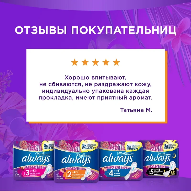 Гигиенические прокладки Always Platinum обеспечивают лучшее сочетание комфорта и защиты среди прокладок Always.Always Platinum более комфортны (по сравнению с Always Ultra) благодаря тысячам микроподушечек и новым, мягким как шелк крылышкам. Они также обеспечивают лучшую защиту (по сравнению с Always Ultra) благодаря защитным боковым барьерам и ультравпитывающему внутреннему слою, который запирает влагу внутри. Always Platinum Супер Плюс (Размер 3) с крылышками рекомендованы для дневного использования при умеренных выделениях. Попробуйте Always Platinum Ночные (Размер 4) — лучшие гигиенические прокладки в линейке Always Platinum для защиты в ночное время. Лучшие комфорт и защита (в линейке Always Ultra). 1000-чи мягких микроподушечек Мягкие как шелк крылышки. Защитные боковые барьеры. Нейтрализуют неприятные запахи Ультравпитывающий внутренний слой Гигиенические прокладки не раздражают кожу (доказано дерматологами).
