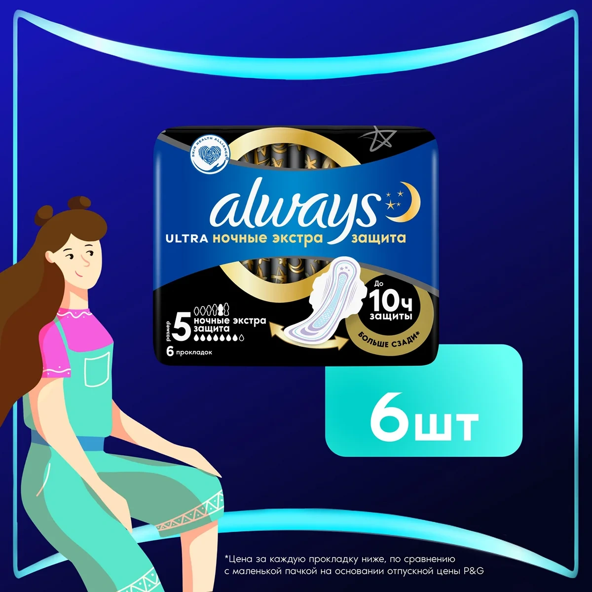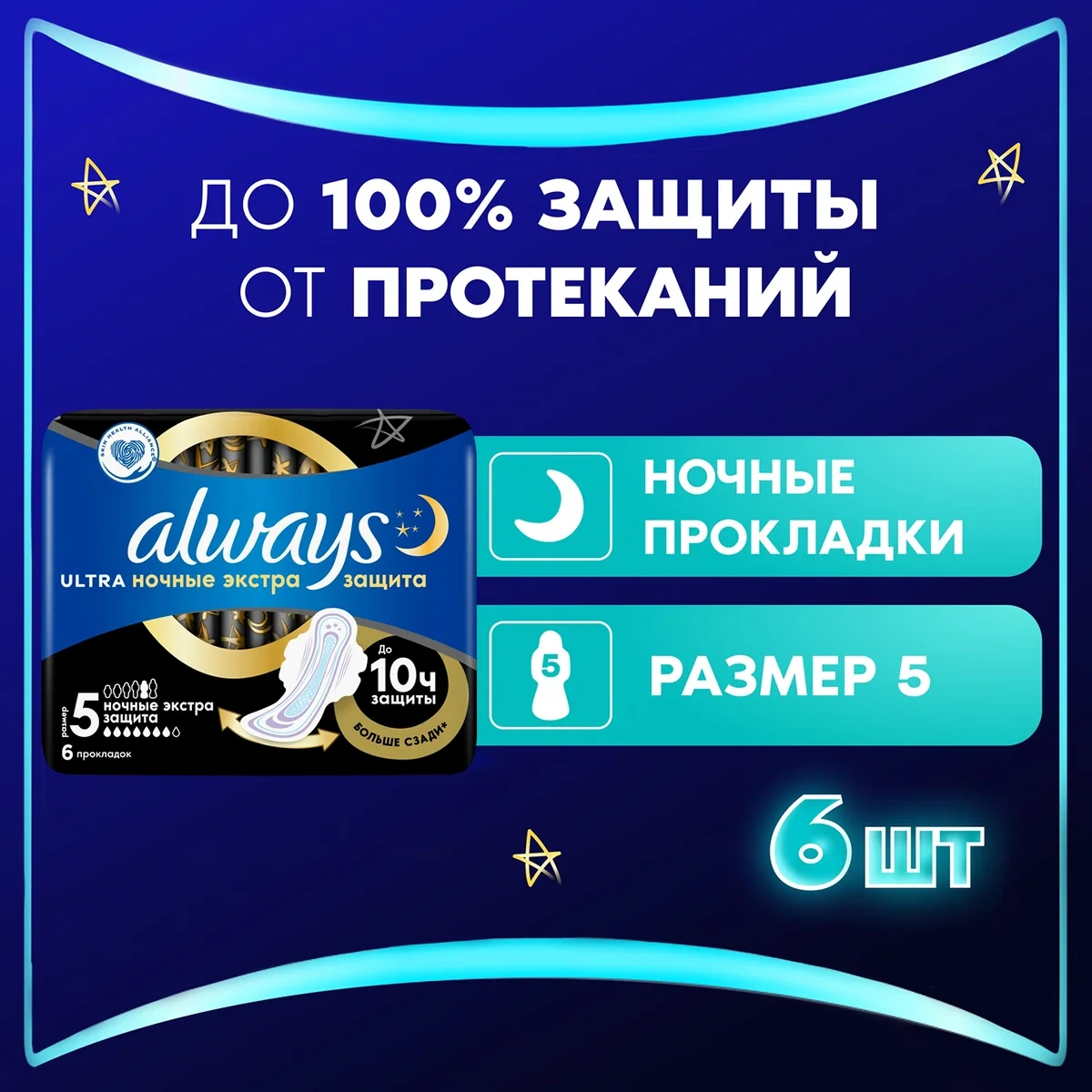 Наслаждайтесь спокойным сном благодаря тройной защите: гигиенические прокладки ALWAYS Ultra Secure Night (ночные экстра защита) с крылышками обеспечивают тройную защиту от протеканий и необходимости менять прокладку ночью. Обеспечьте себе наилучшую защиту с помощью Always My fit — специальной системы определения размера, которая помогает правильно подобрать прокладку на основании количества выделений и размера трусиков - Увеличенная на 60% площадь задней части, по сравнению с Ultra Light (Размер 1), для дополнительной защиты в ночное время - Технология Защитные барьеры удерживает жидкость, предотвращая протекания - Система Сразу сухо впитывает жидкость за считаные секунды - Технология Блок запаха нейтрализует неприятные запахи - Гигиенические прокладки не раздражают кожу (одобрено Ассоциацией здоровья кожи Skin Health Alliance) - Крылышки помогают удерживать прокладку на месте для надежной защиты и ощущения комфорта.