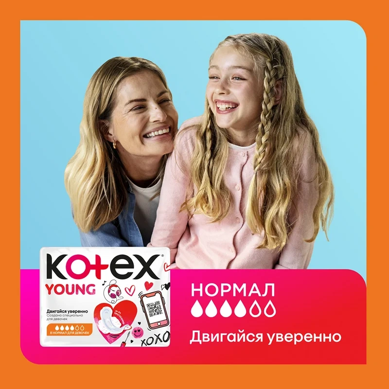 Обновленные женские гигиенические прокладки Кotex Young Normal – наша лучшая защита и комфорт для девочек! Благодаря уникальному верхнему слою и дополнительному абсорбирующему компоненту, прокладка впитывает быстро и на 50% больше, обеспечивая ощущение сухости и усиленной защиты. Экстра мягкий верхний слой, дышащая задняя поверхность и лучшее прилегание к телу, дарят максимальный комфорт. Прокладка разработана специально для молодых девушек и для первых лет после начала месячных! Стильный дизайн с ярким узором поднимет настроение!?В упаковке 8 прокладок для девочек подростков.