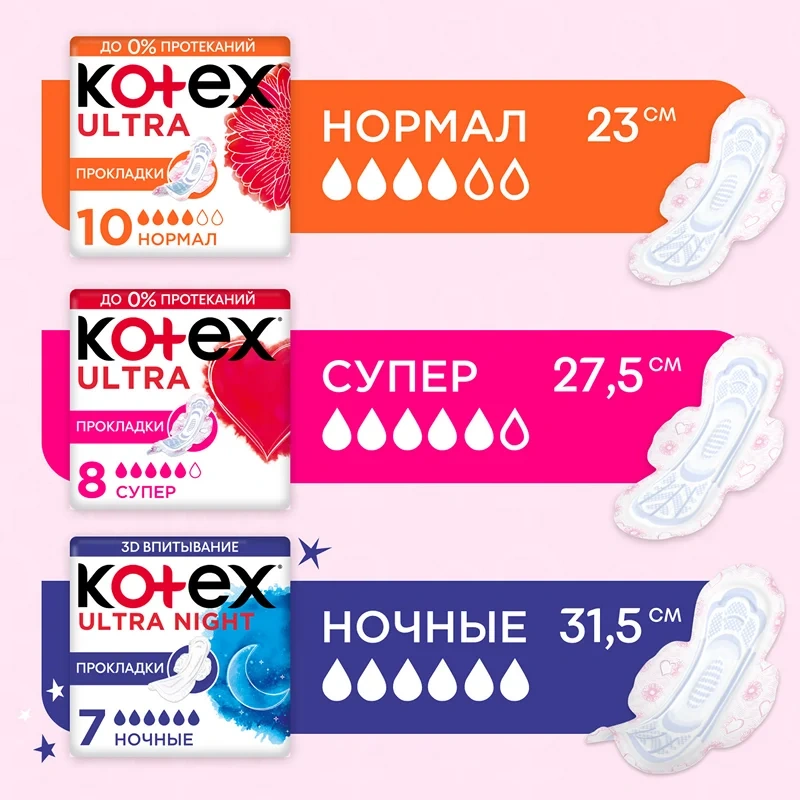 KotexUltra Нормал для умеренных выделений. Улучшенная защита и новый стильный дизайн. Обеспечивают комфорт и уверенность до 100%*. Прокладка стала более гибкой, чтобы лучше подстраиваться под анатомию твоего тела и защищать от протеканий. Уникальный 3D центр – быстро впитывает. Эластичные желобки – придают прокладке гибкость для защиты от протеканий сзади. Подстраивающийся внутренний слой – адаптируется под анатомию твоего тела. Покрытие мягкая сеточка для максимального комфорта и сухости кожи. Мягкие крылышки, надежно крепятся к белью и не натирают кожу. Эстетичная форма прокладки и нежный женственный дизайн добавят удовольствия при использовании. Обновленный дизайн упаковки – стильный и современный. *Опрос потребителей. Россия. 2019. По сравнению с предыдущей линейкой Котекс Ультра Нормал.