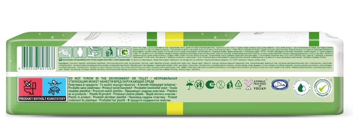 Molped Pure&Soft c мягкой поверхностью и добавлением органического хлопка бережно относятся к коже, не вызывают раздражения и сыпи. Прокладки дерматологически протестированы и содержат 0% красителей, нейлона и хлора, обеспечивая максимальный комфорт коже. Предназначены для комфортного сна во время критических дней. Мягкая верхняя поверхность прокладки, изготовленная с добавлением органического хлопка, нежно соприкасается с кожей и не вызывает раздражений. Впитывающий слой изделия быстро поглощает влагу, а анатомическая форма гарантирует плотное прилегание и свободу движений. Эти прокладки отличаются хорошей воздухопроницаемостью, что позволяет избежать парникового эффекта. Они не содержат нейлона, красителей и хлора, не шуршат при ходьбе, не имеют аромата. Удобные крылышки обеспечивают надежную фиксацию изделия на нижнем белье, а удлиненная форма снижает риск протеканий.