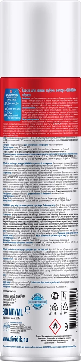 Состав: менее 5% – d-лимонен, отдушка, фторкарбоновая смола; от 15% до 30% – нефрас; более 30% – спирт изопропиловый, алифатические углеводороды (бутан, изобутан, пропан).