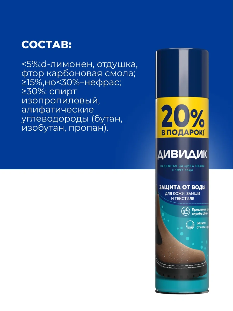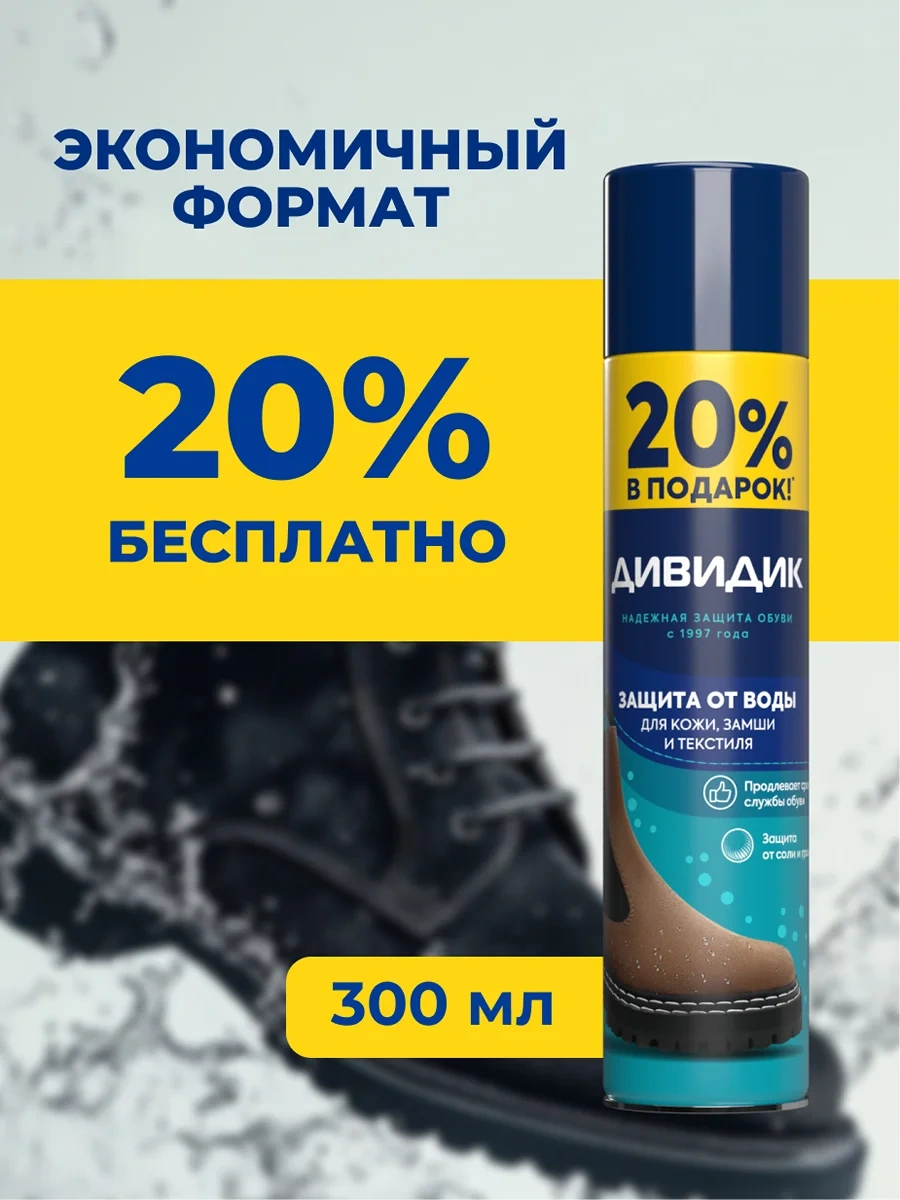 Водоотталкивающая пропитка Дивидик – это средство для защиты обуви от влаги, грязи, снега и других внешних воздействий. Универсальный спрей подходит для всех типов материалов, включая замшу, кожу, велюр, текстиль, нубук и мембранные ткани, обеспечивая долговечность и стойкость к погодным условиям.