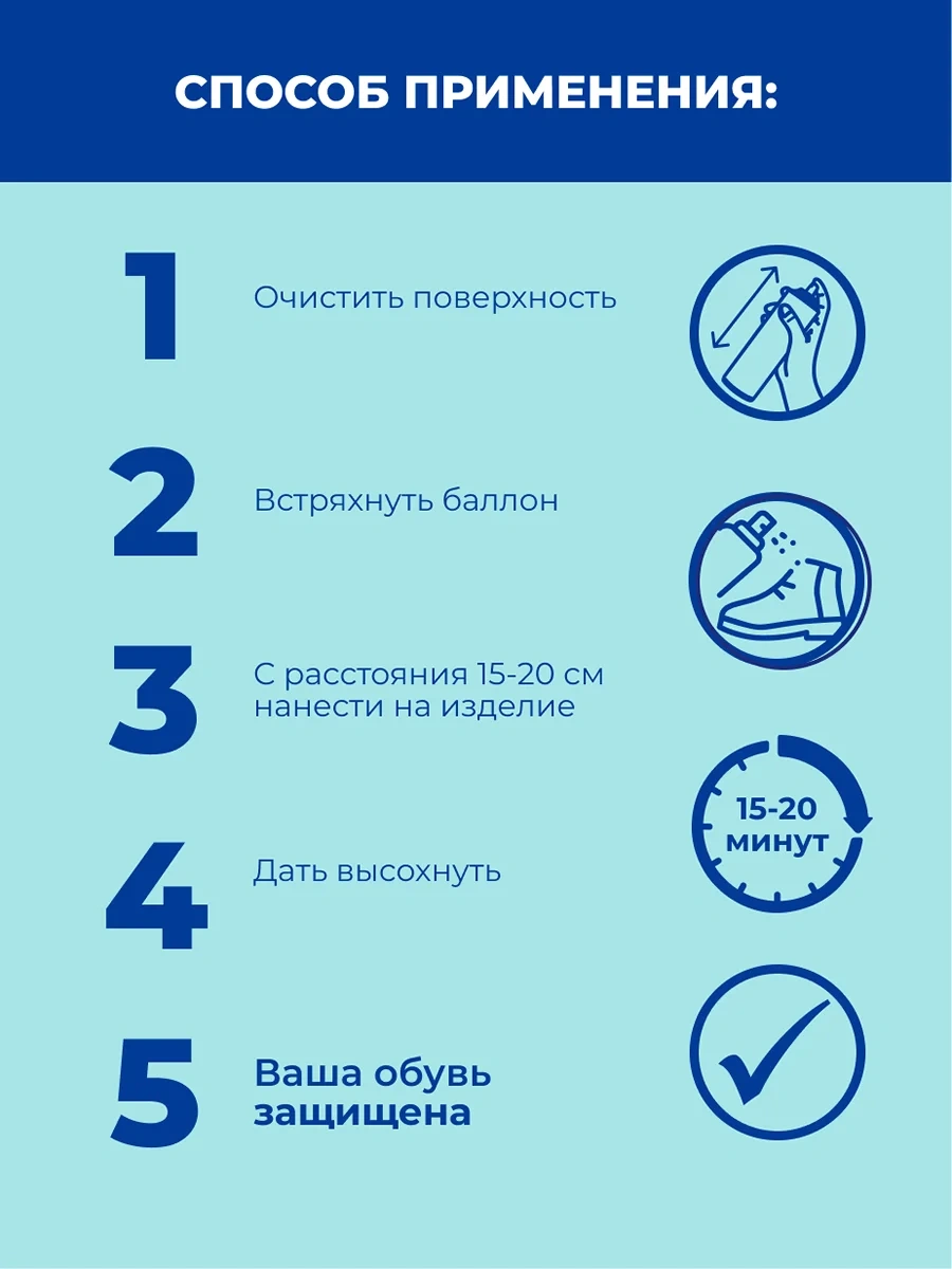 Распылите аэрозоль на сухую и чистую поверхность, подождите пару минут, после чего обувь будет готова к использованию даже в дождливую погоду.