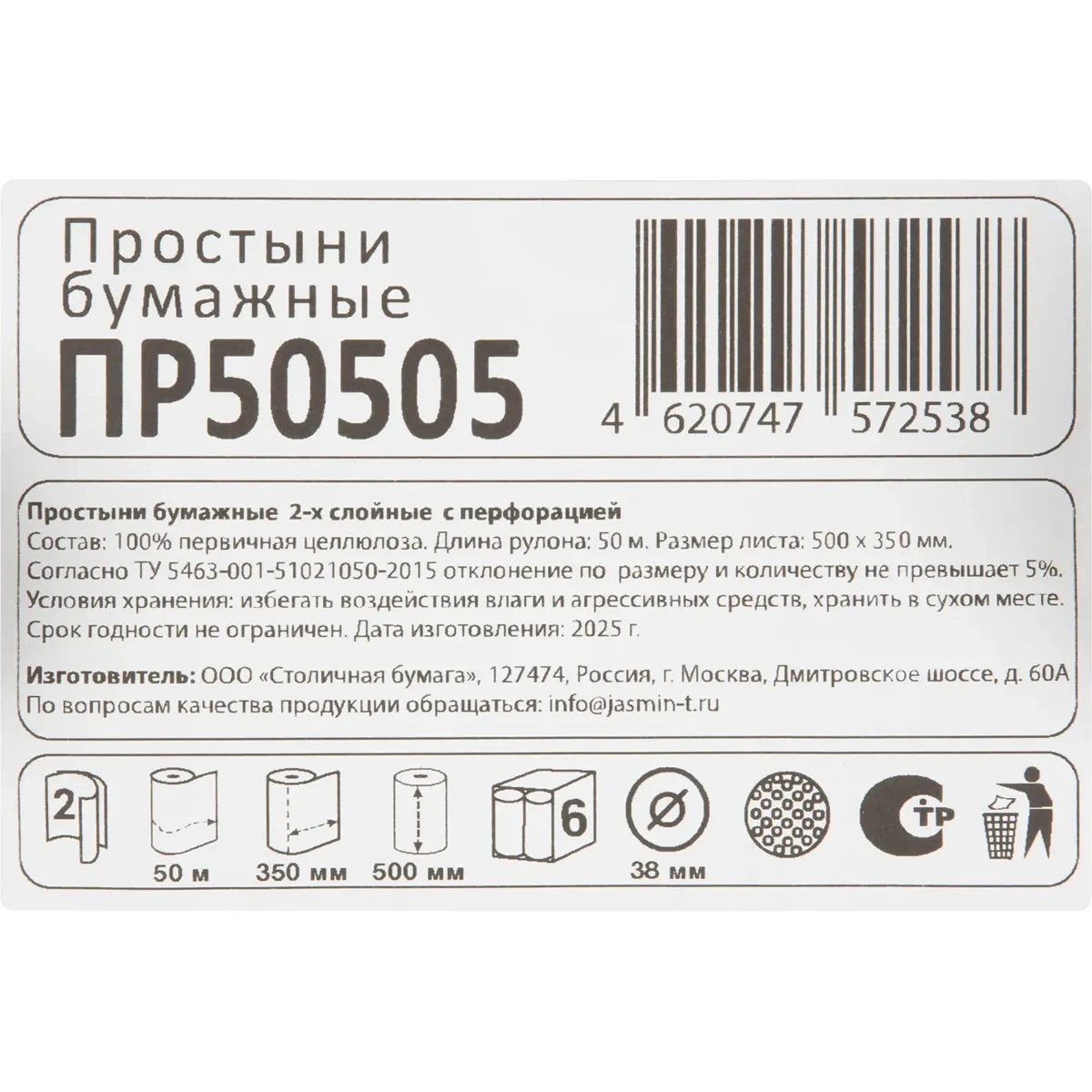 Простыни бумажные Jasmin 2х сл. 50 м. белые, 6 рул/уп