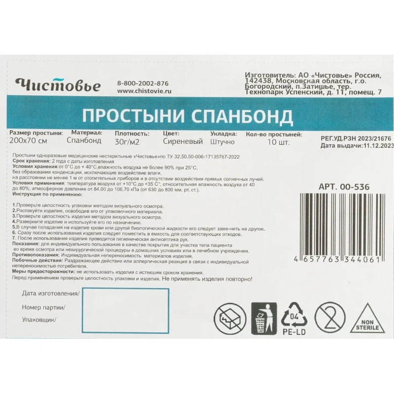 Гигиеническая простыня, изготовленная из гипоаллергенного материала спанбонд с плотностью 30 г/кв.м, предназначена для использования в банях, саунах, кабинетах стоматологии, массажных салонах, СПА-центрах, медицинских учреждениях и салонах красоты. Простыня не имеет перфорации и не обладает впитывающими свойствами. Срок годности составляет 36 месяцев.